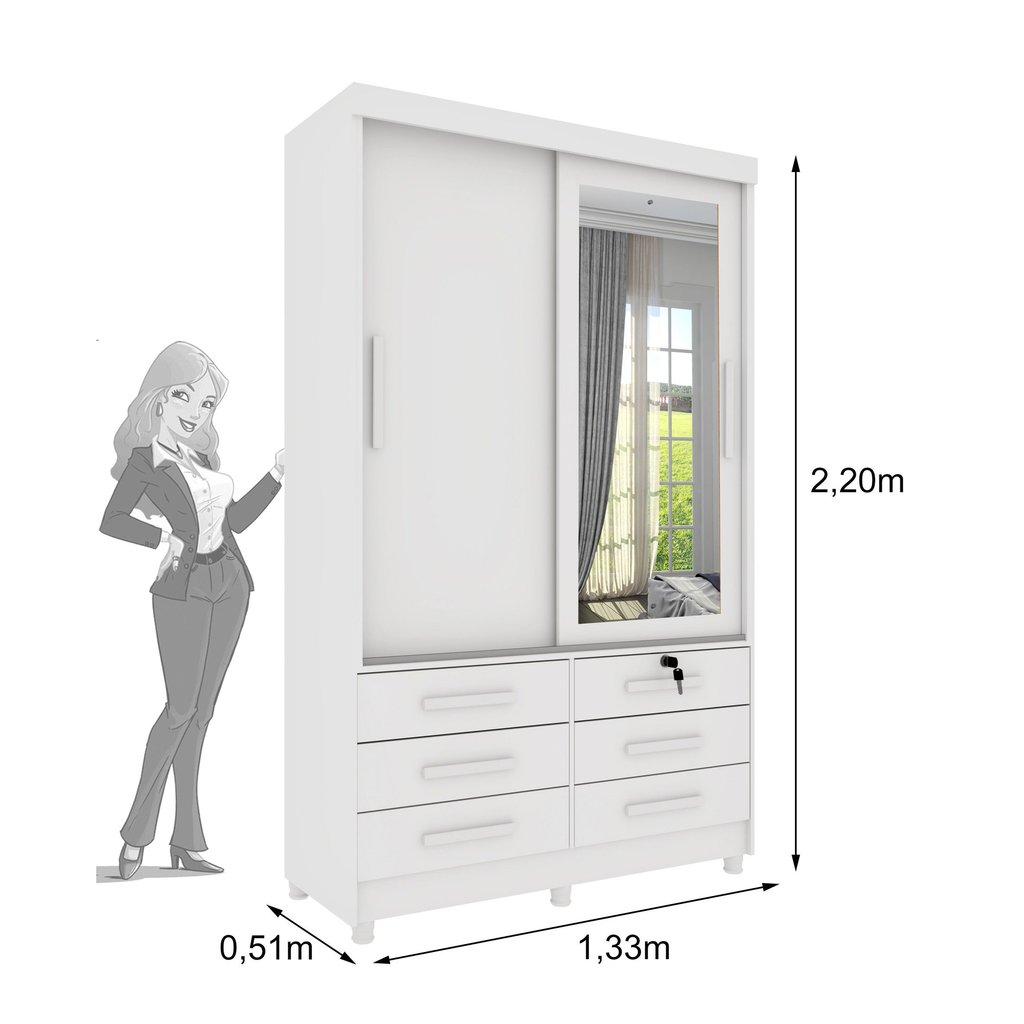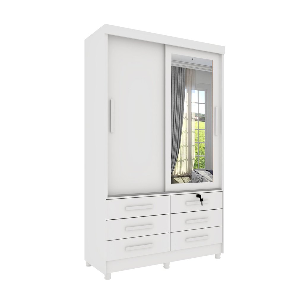 Guarda Roupa Solteiro com Espelho e pés 2 Portas 6 Gavetas 133cm Chicago Neve
