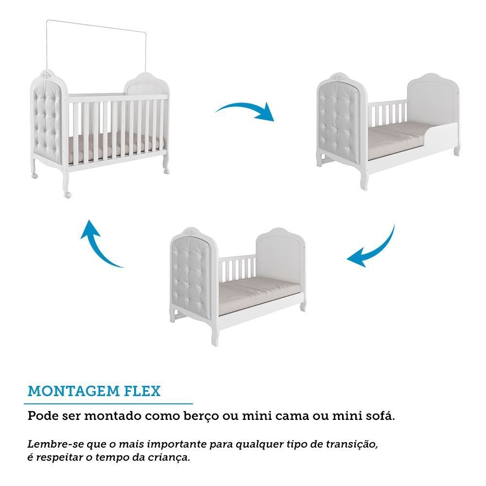 Berço Mini Cama 3 em 1 com Capitonê 100% MDF Maya Espresso Móveis Branco Brilho