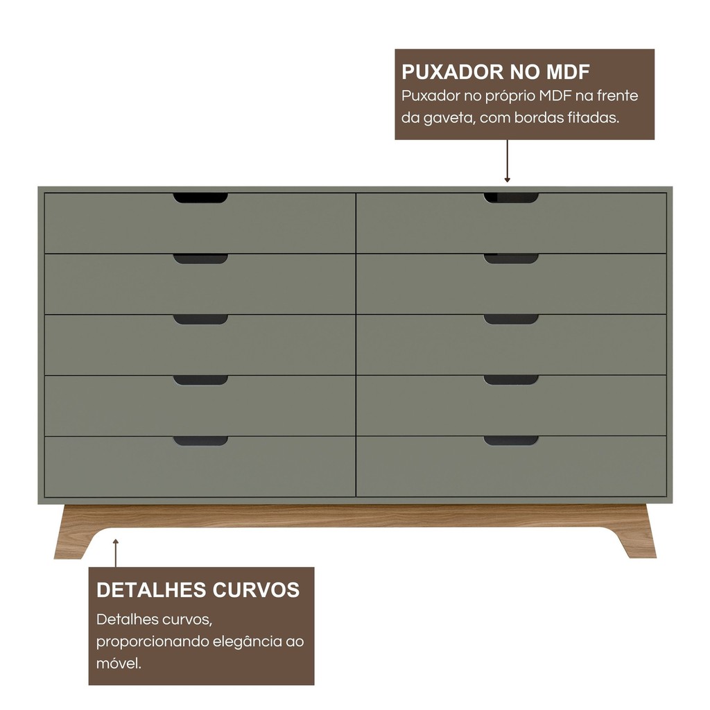 Cômoda Alice 10 Gavetas em 100% Mdf Verde/Louro Freijó