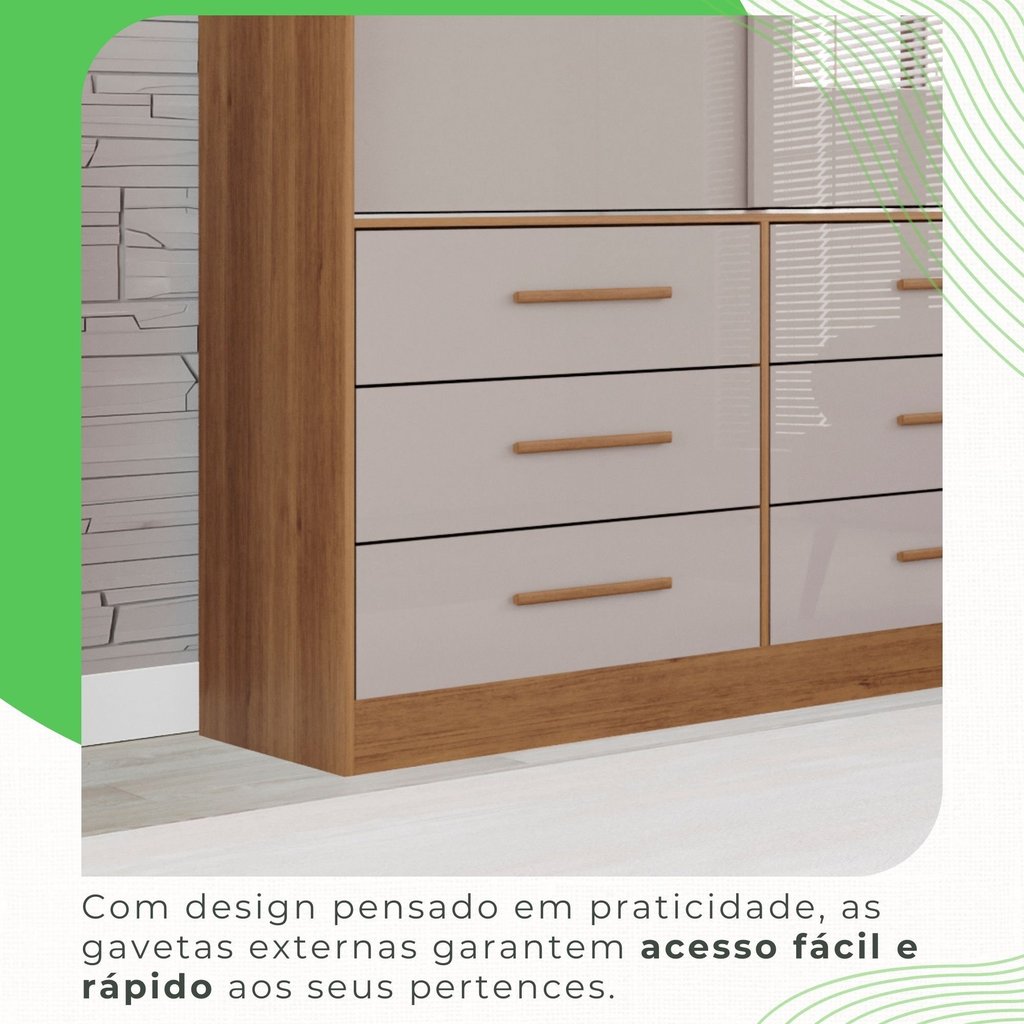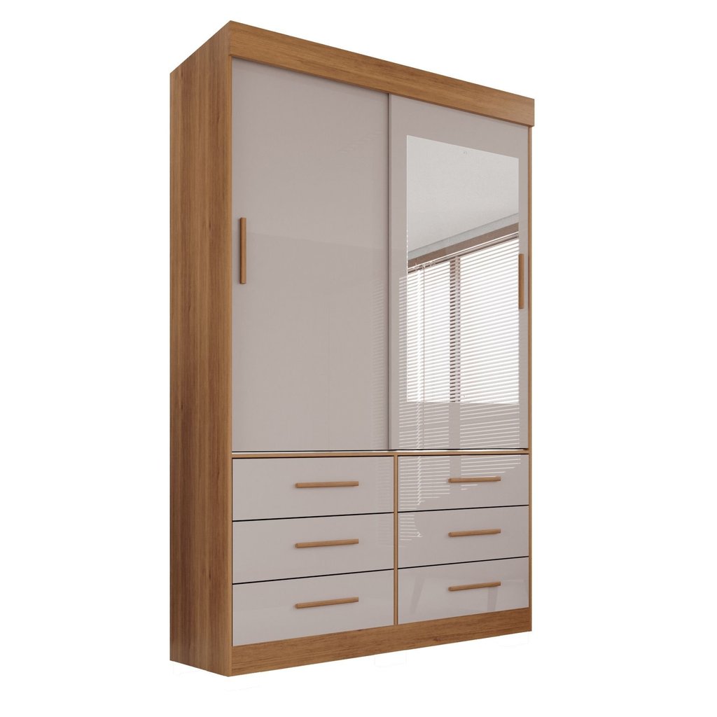Guarda Roupa Solteiro 2 Portas com Espelho 6 Gavetas Luana Cinamomo/Off White