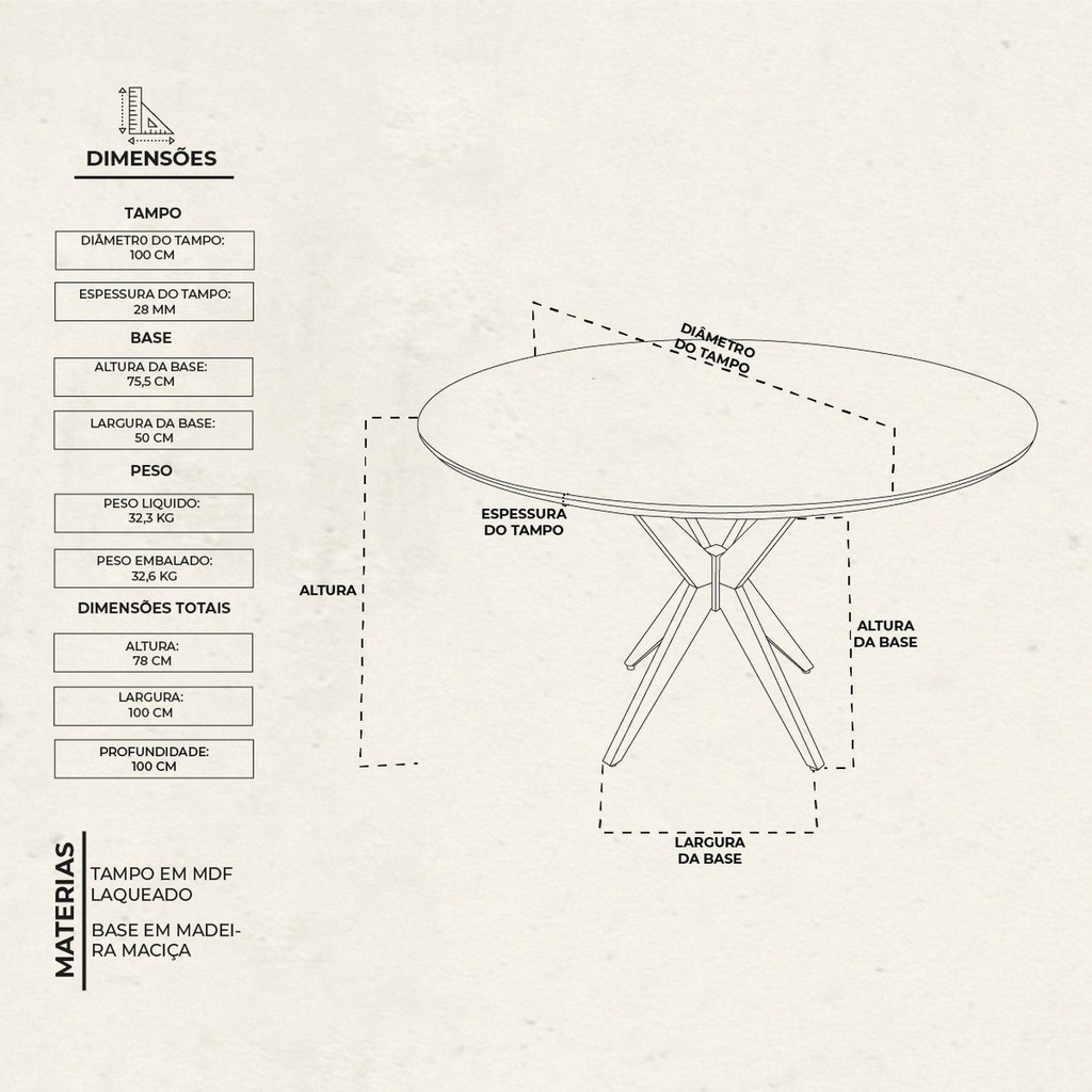 Mesa de Jantar Base Estrelada de Madeira Maciça 100cm Alice 100