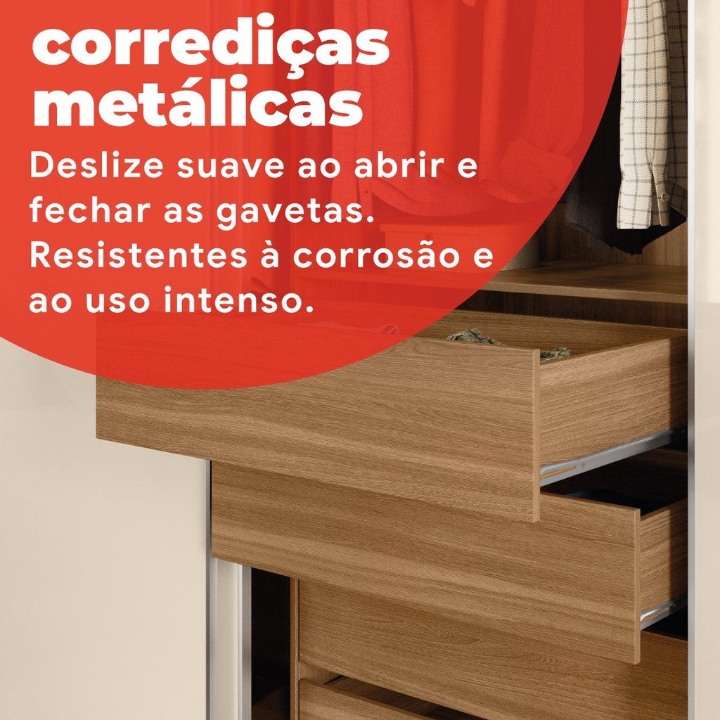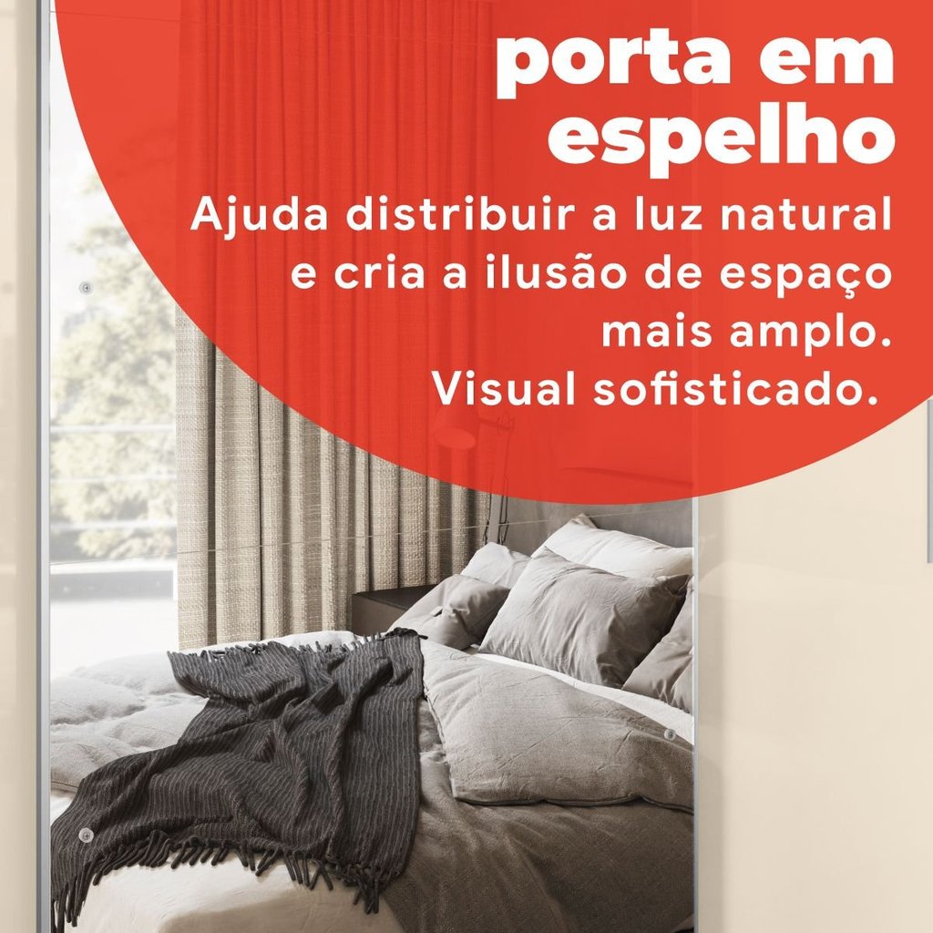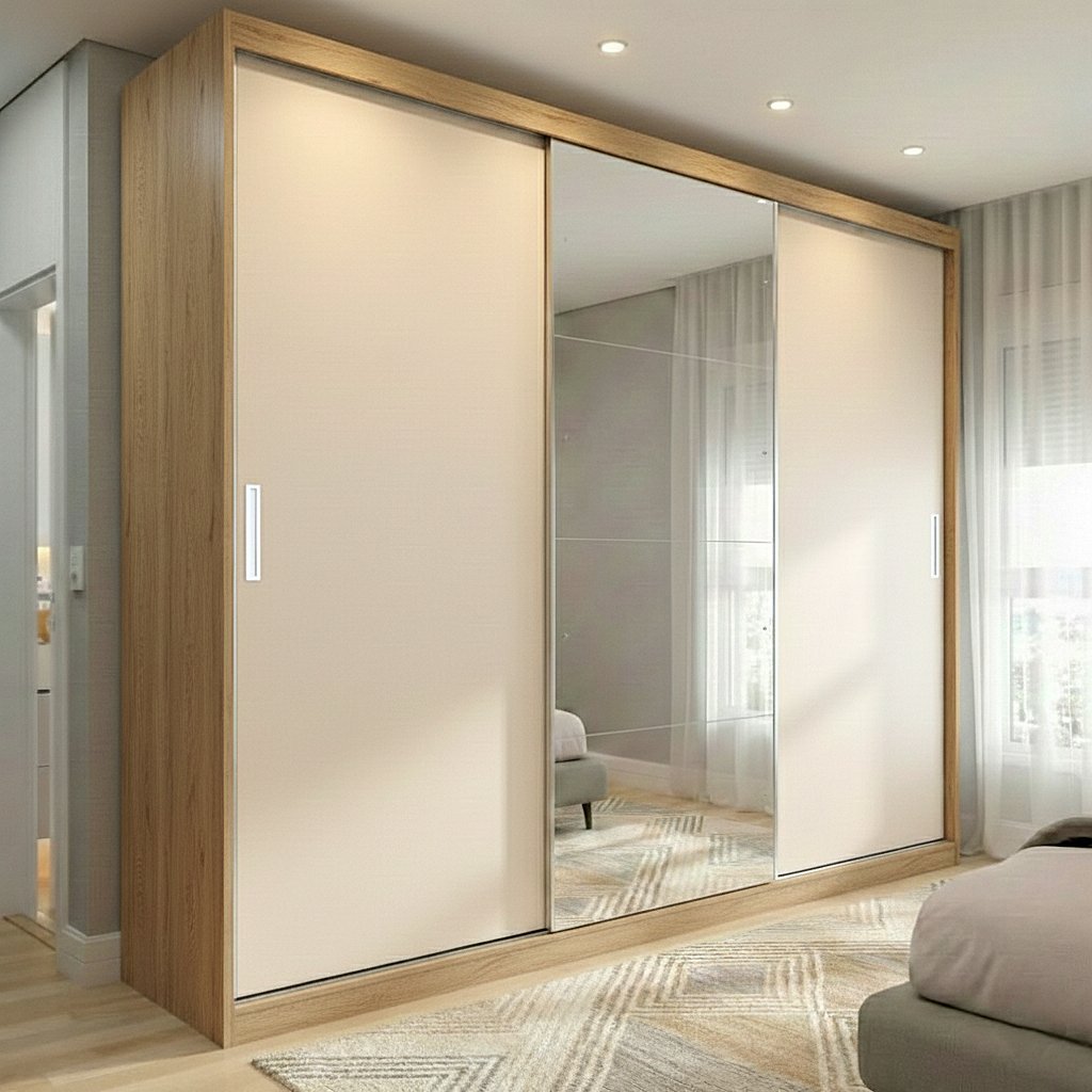 Guarda Roupa Casal com Espelho 3 Portas de Correr 100% MDF London Amendoa e Off White Amendola Touch/Off White