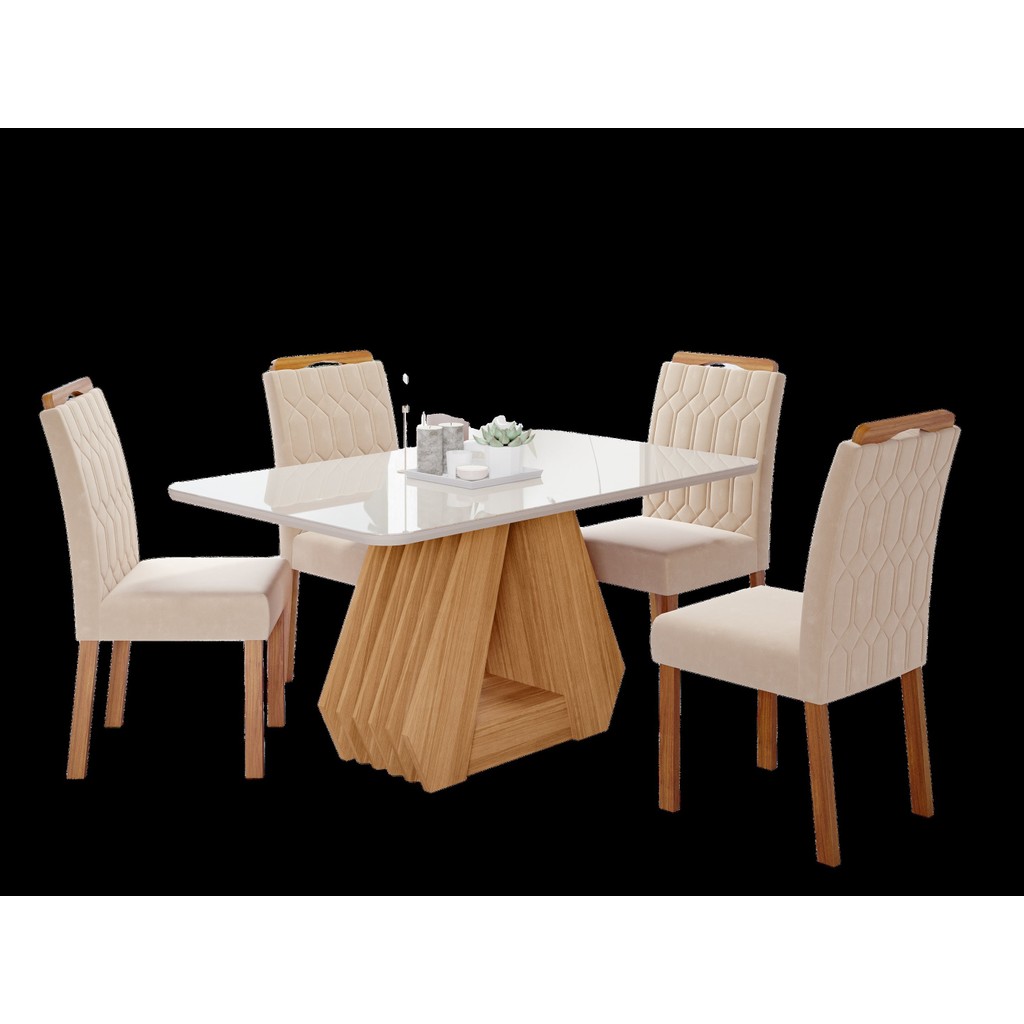 Conjunto Sala de Jantar Mesa Agata com 4 Cadeiras Paola Tampo de Vidro retangular Nature/Off White/Nude