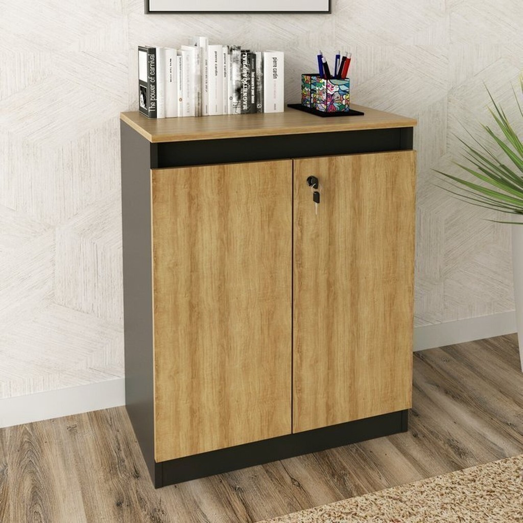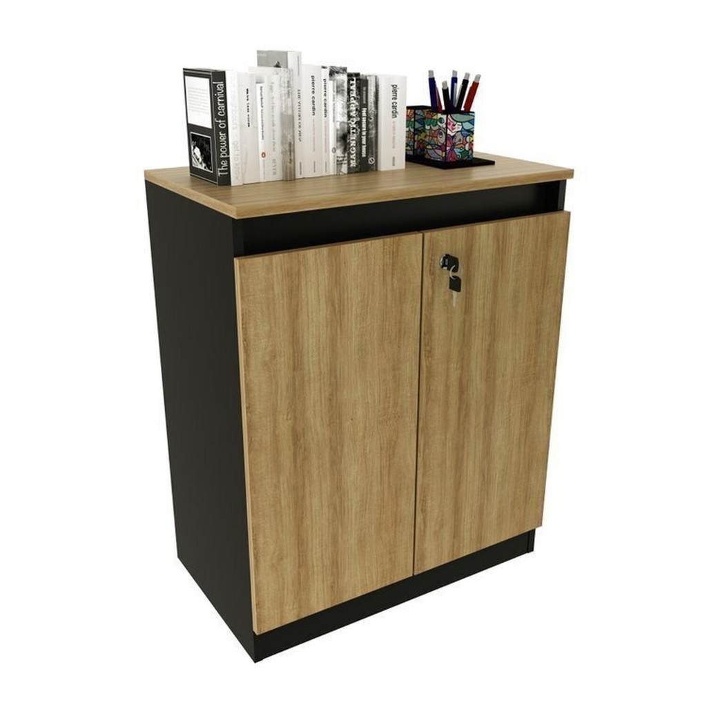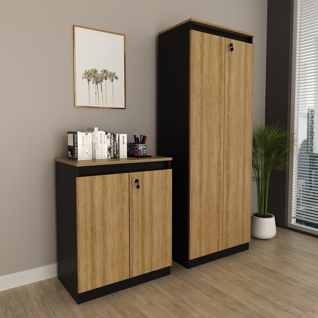 Kit 2 Peças Armário Escritório com 2 Portas com Chave, Balcão para Escritório com Chave e 2 Portas Amêndoa/Preto