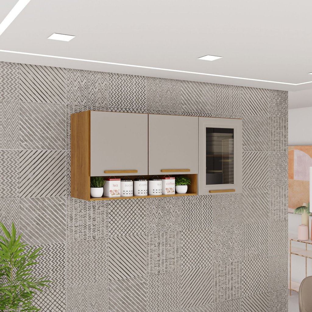 Armário Aéreo 3 Portas Vidro Fumê Bella Cinamomo/Off White