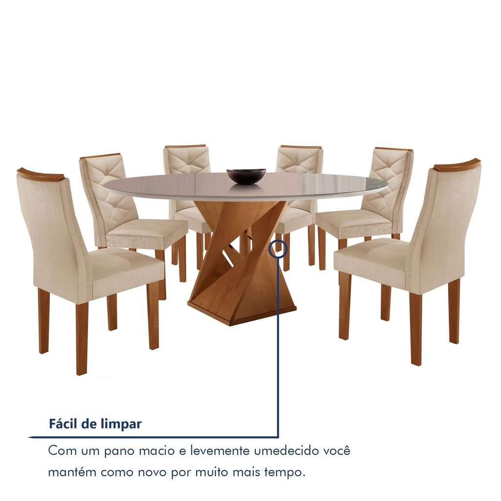 Conjunto Mesa Redonda com Vidro e 6 Cadeiras Tampo 120cmx120cm Barcelona Yescasa Cinamomo/Off White/Suede Pena