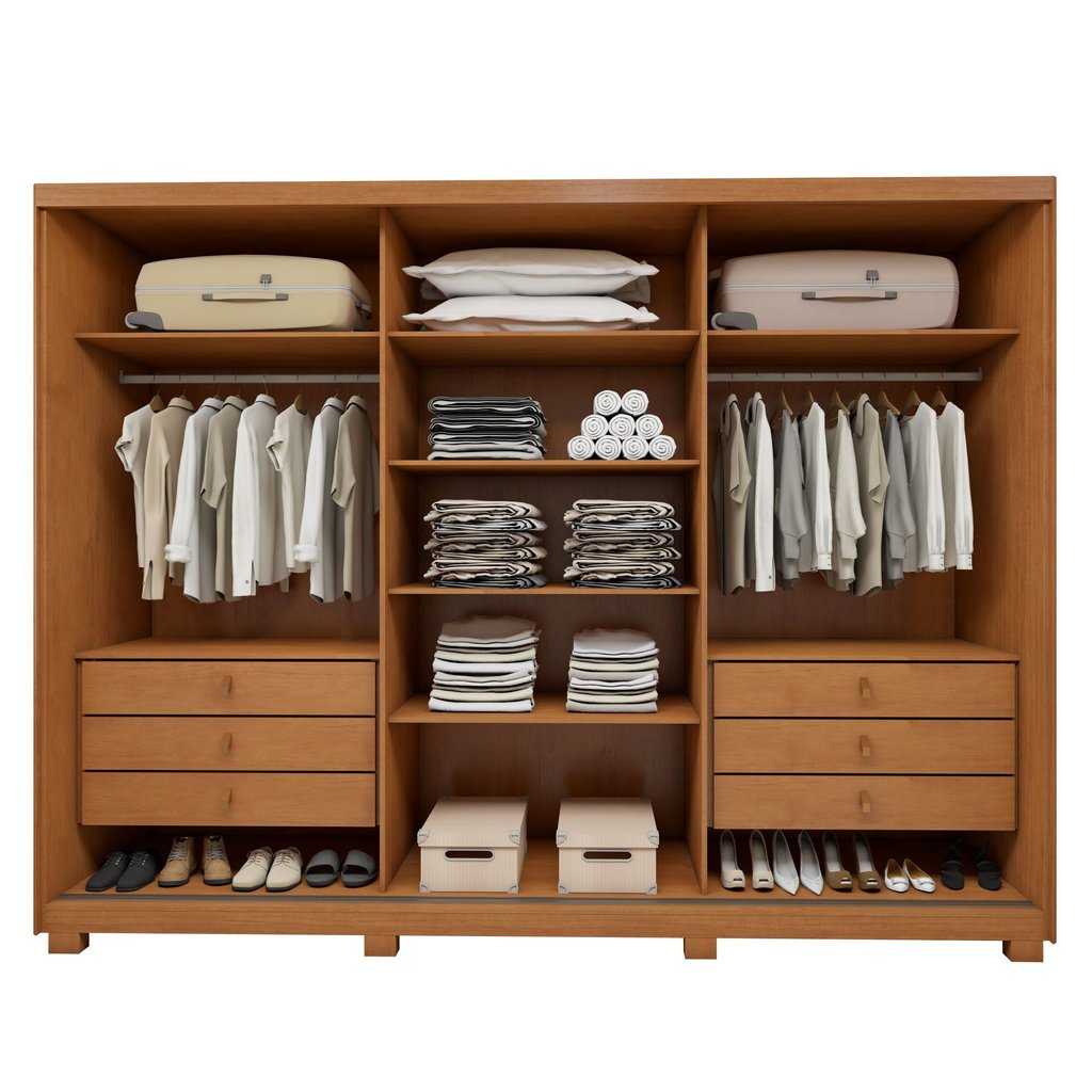 Guarda Roupa Ollie 3 Portas 6 Prateleira 6 Gavetas 100% MDF com Pés Amêndoa Clean/Off White/Amêndoa Clean