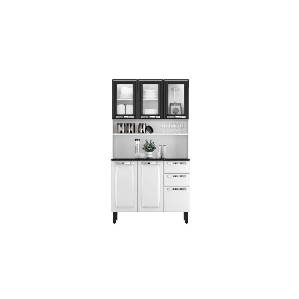 Cozinha Compacta em Aço 6 Portas (sendo 3 de Vidro) 2 Gavetas 105cm Pratika Itatiaia Branco/Preto