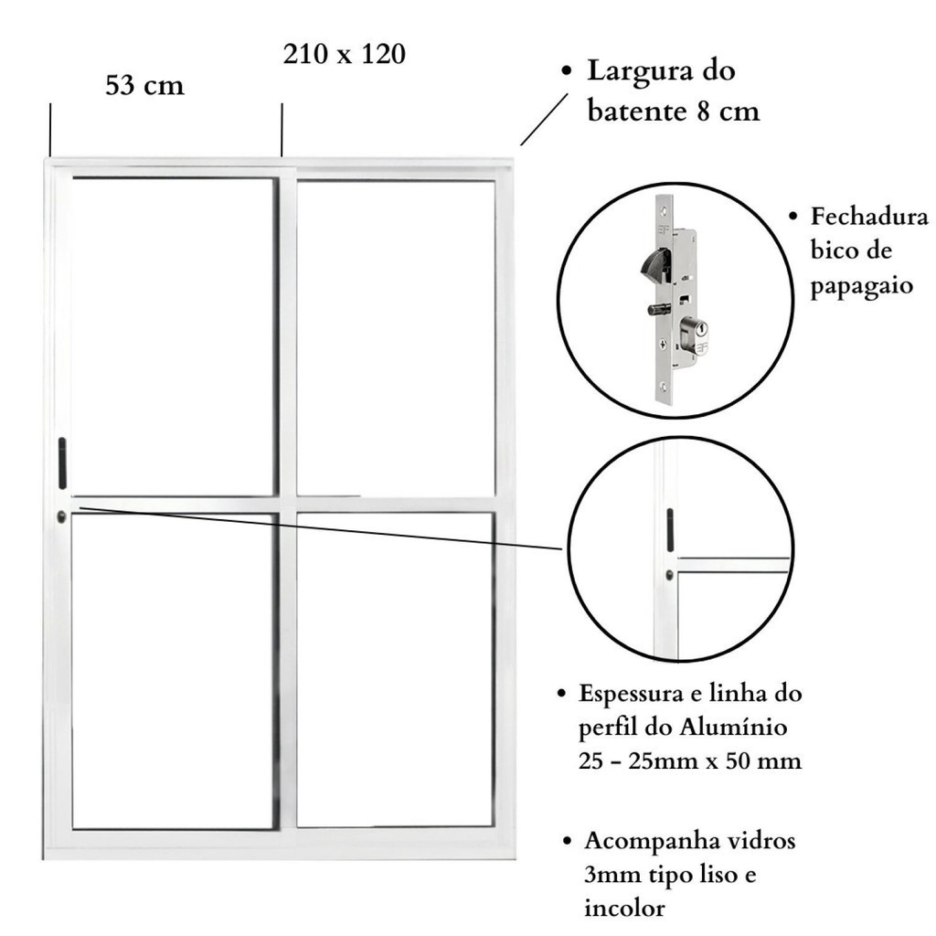 Porta Sacada de Alumínio 2 Folhas 210 X 120cm com Fechadura Linha 25 Branco