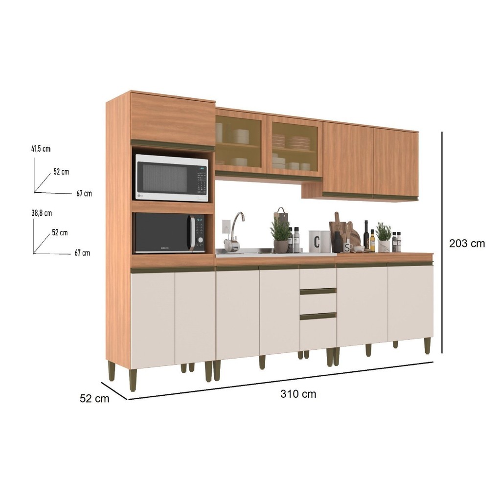 Cozinha Completa 5 Peças 11 Portas com Torre Quente e Vidro Reflecta Cecília Off White/Freijó