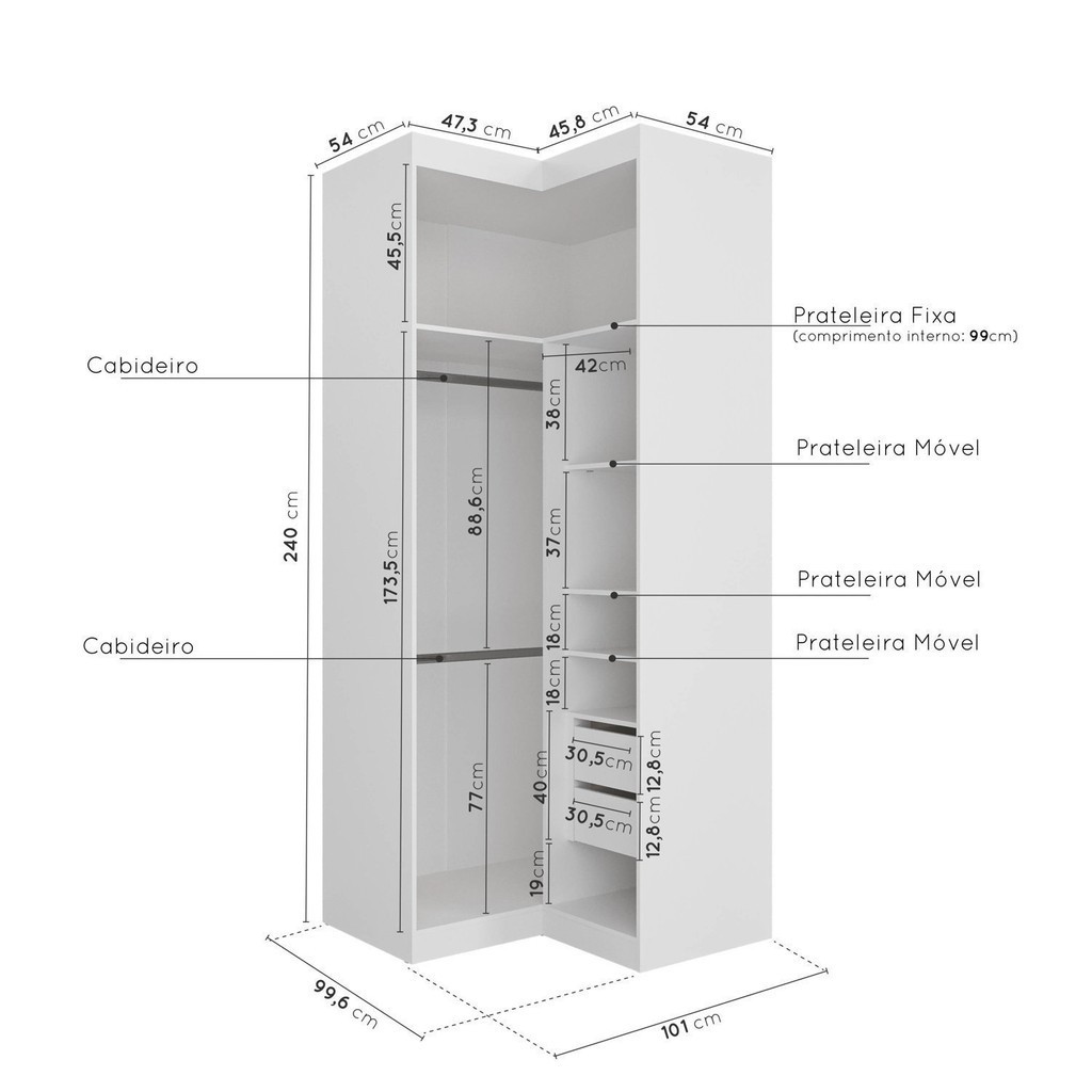Guarda Roupa de Canto Reto Modular com 3 Prateleiras 2 Gavetas Hera Cabecasa Madeiramadeira Algodão/Louro