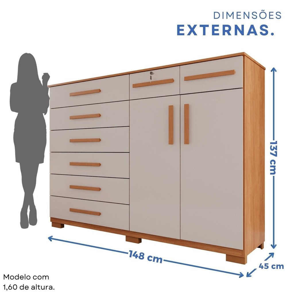 Cômoda para Quarto 2 Portas 8 Gavetas Esmeralda Expresso Móveis Cinamomo/Off White