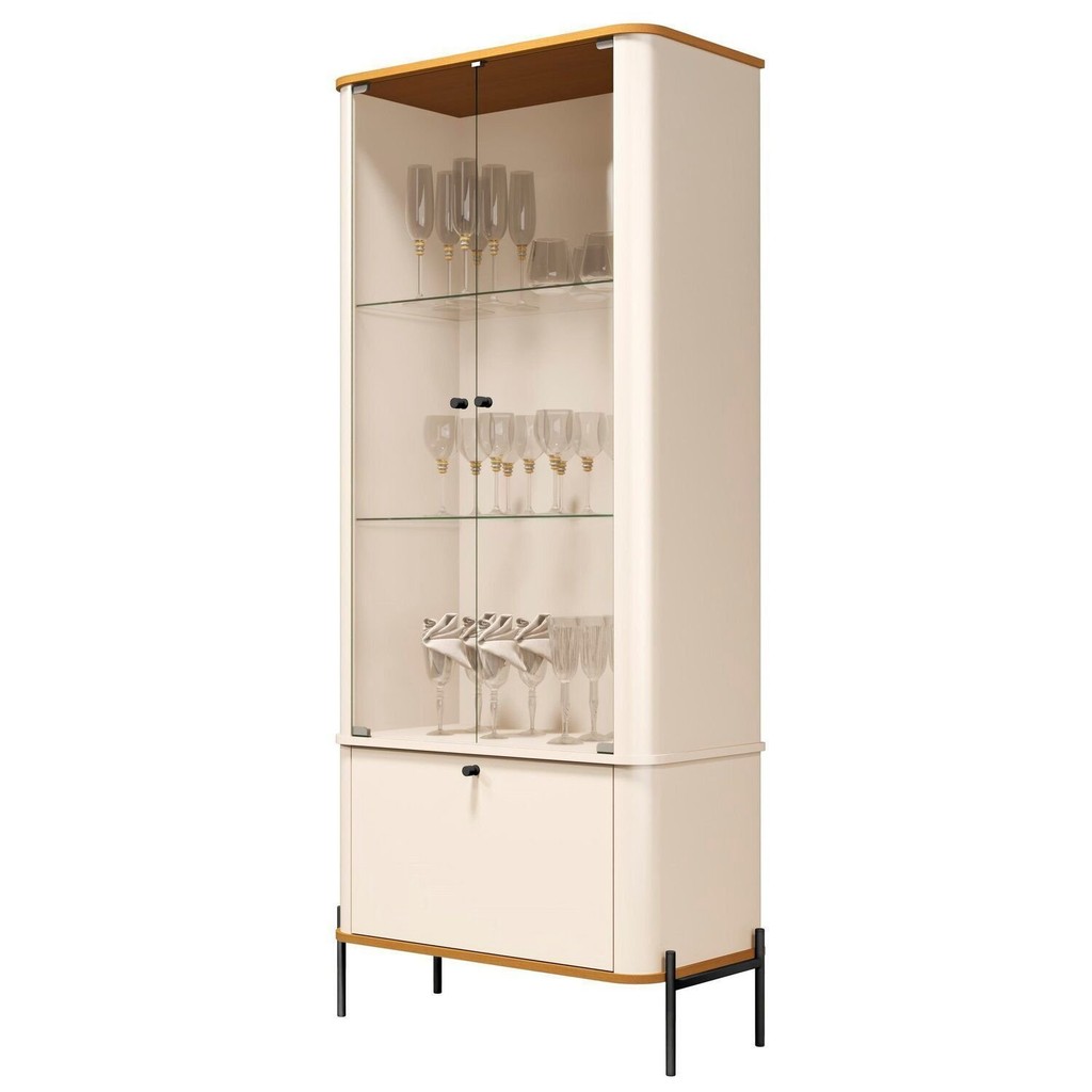 Cristaleira Curva 3 Prateleiras e Portas em Vidro Puxador e Pés em Metal Tucupi Off White/Nature/Preto