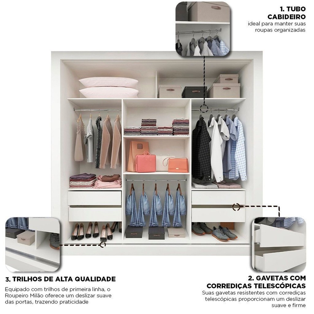 Guarda-roupas Casal 3 Portas 100% Mdf Milão Yescasa Branco