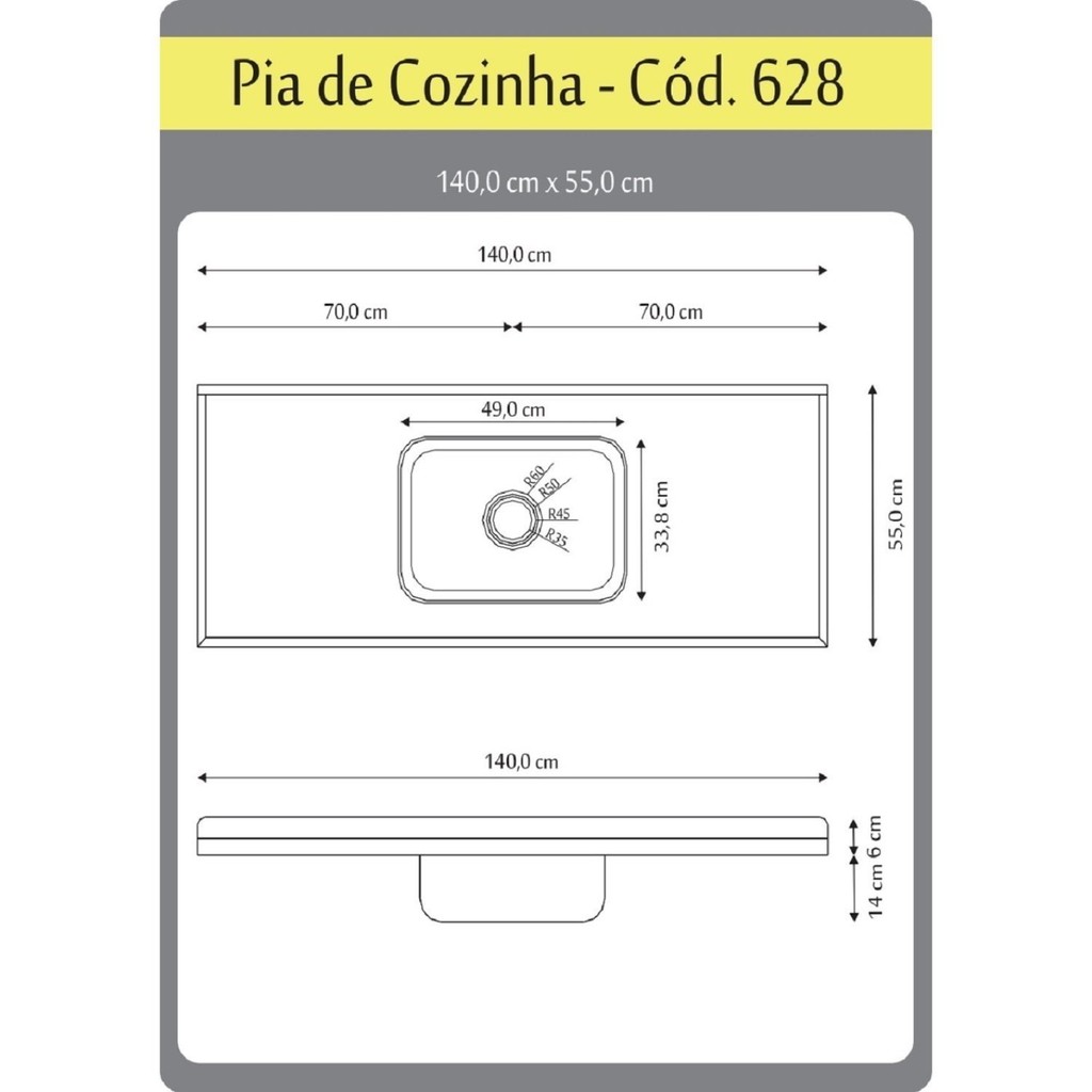 Pia para Cozinha em Mármore Sintético com Cuba em Aço Inox 140cmx55cm Aj Rorato Preto