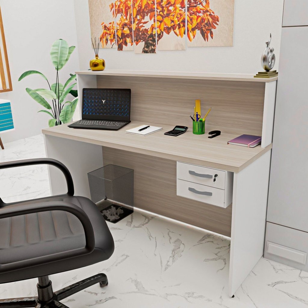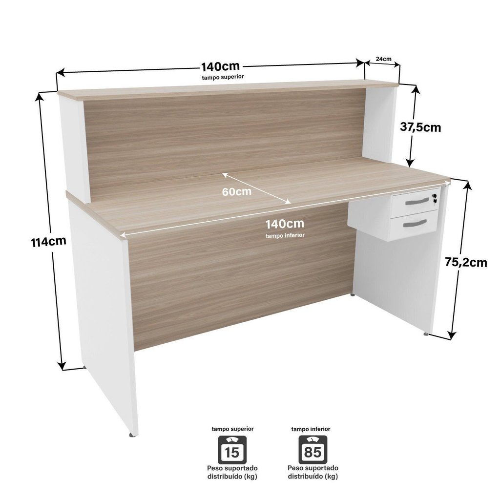 Balcão Atendimento Recepção Consultório 140x60cm 2 Gavetas Carvalho/Branco