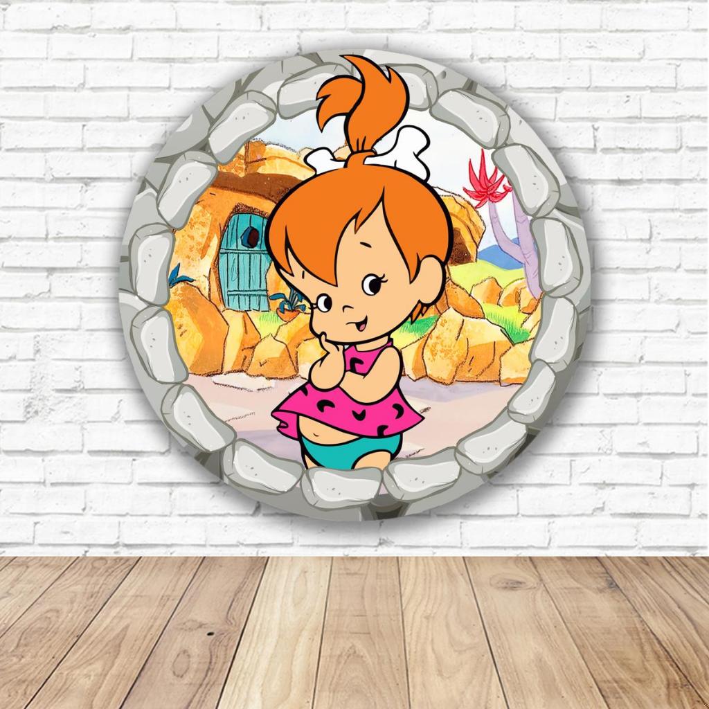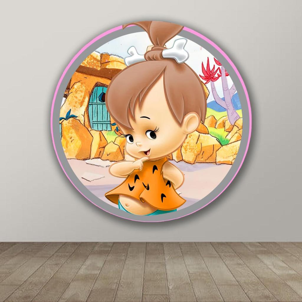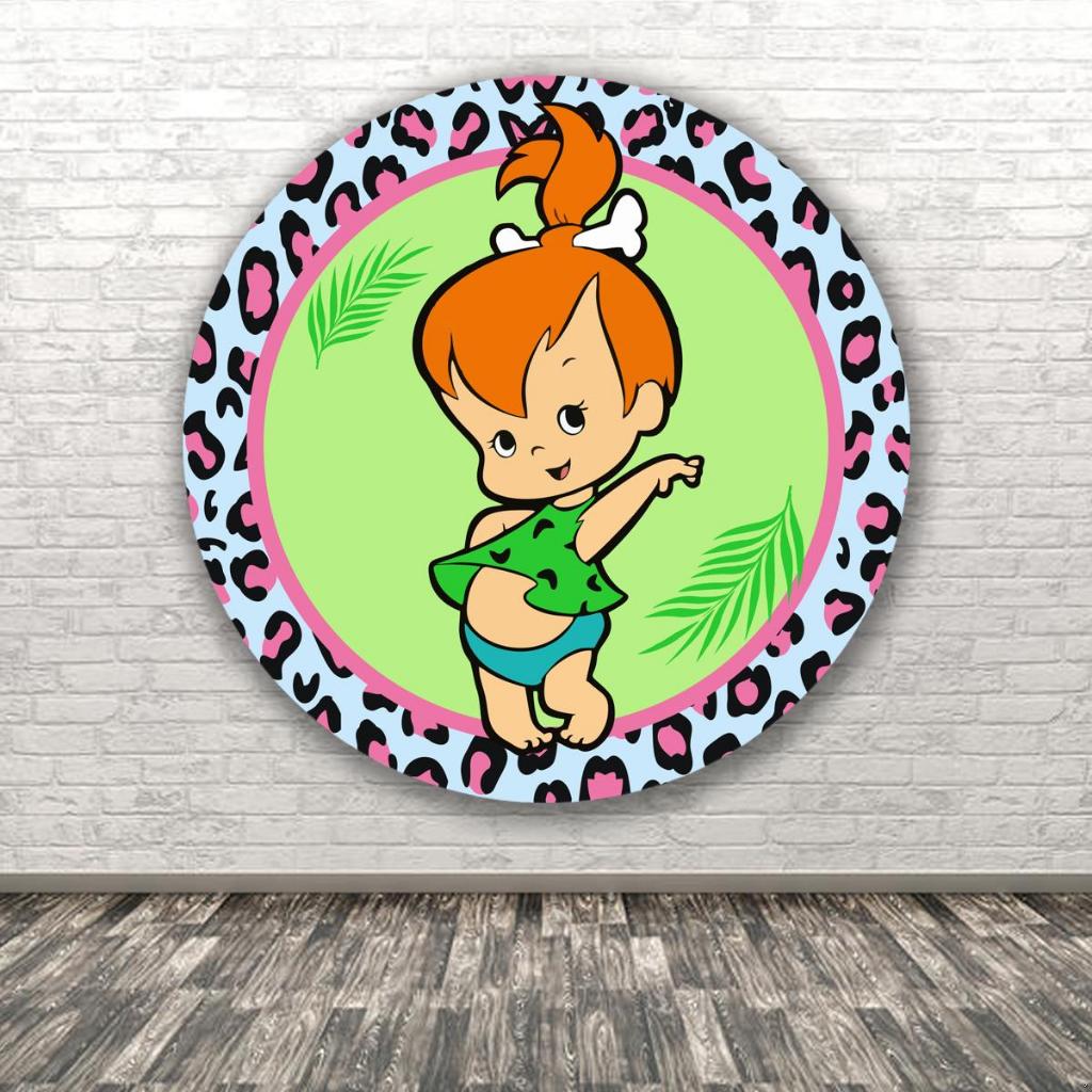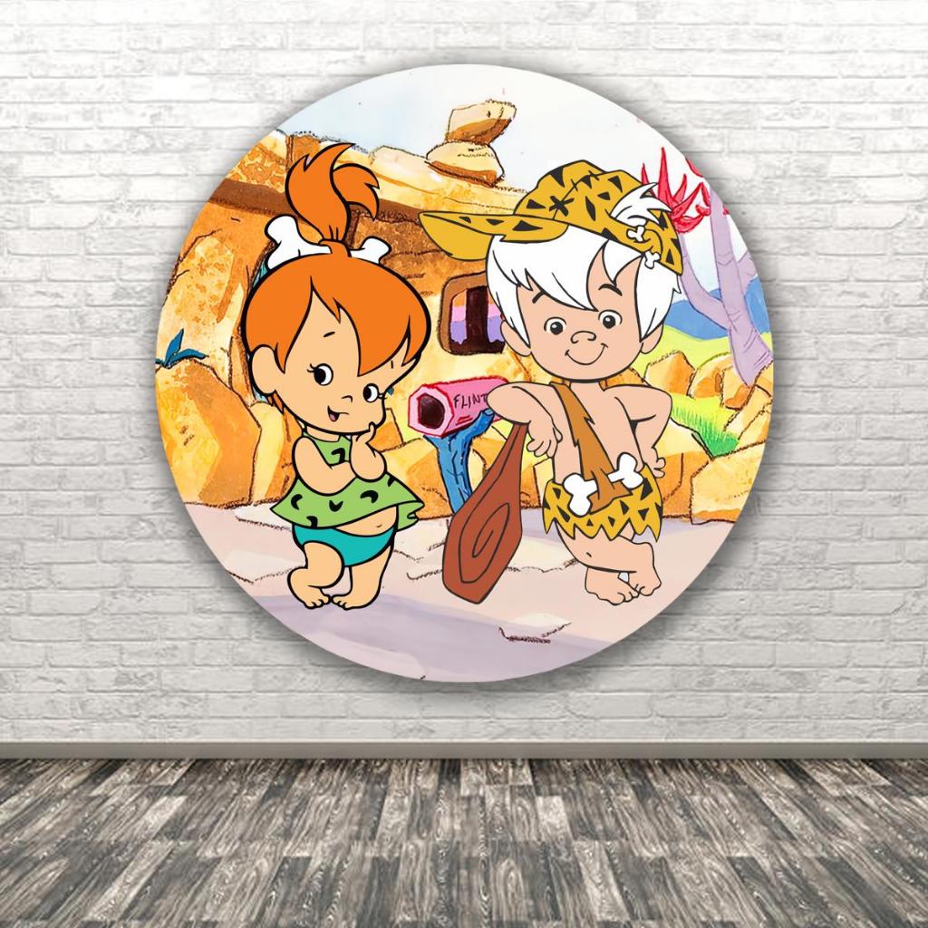 Painel Redondo Tematico Pedrita e BamBam flintstones Desenho Descoração Festa Evento Cenario Fotografico Malha Sublimada