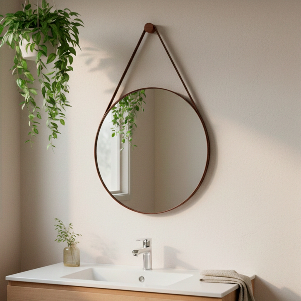 Espelho Redondo Decorativo Adnet Suspenso c/ Alça de Couro 60cm +Suporte de Fixação - Casa Domo