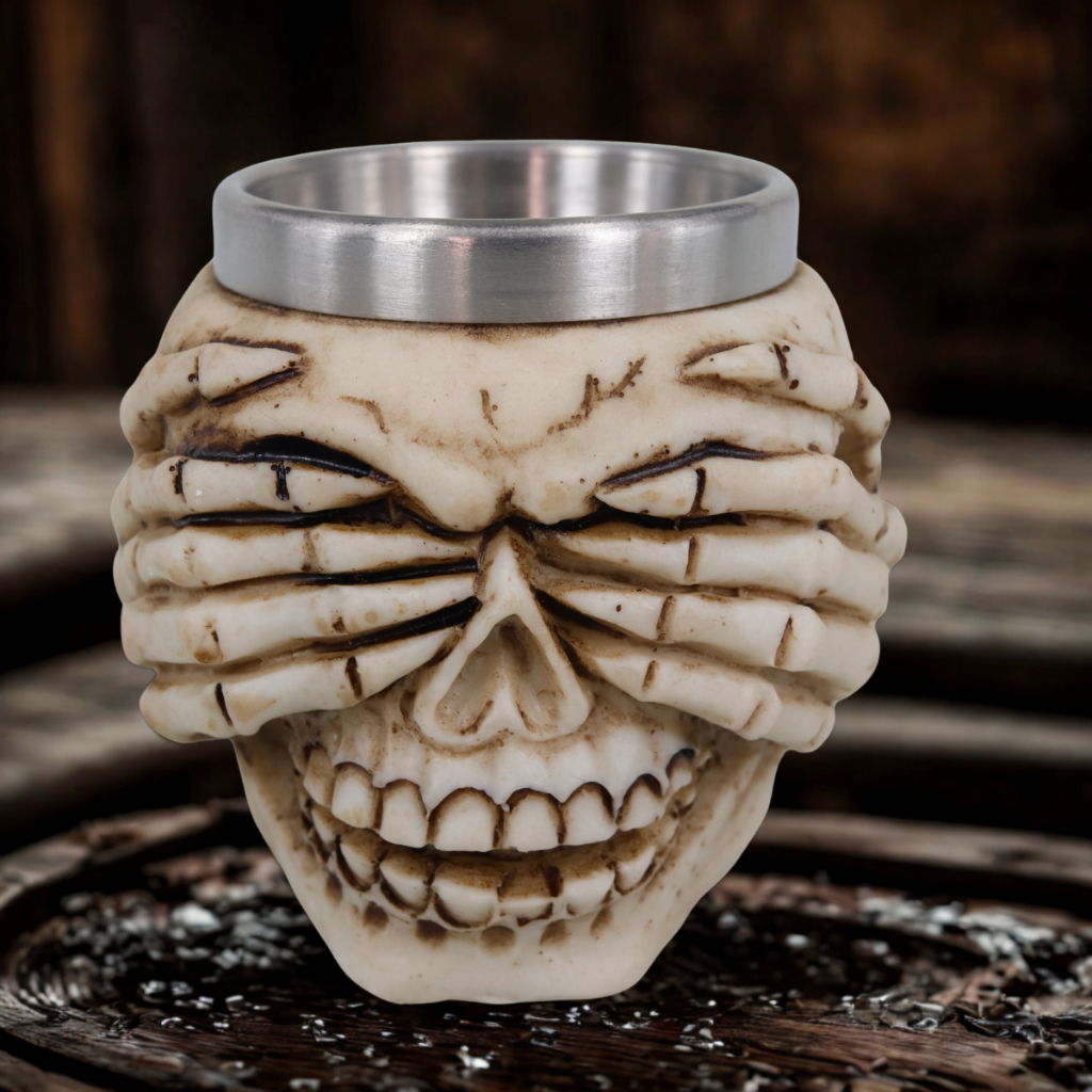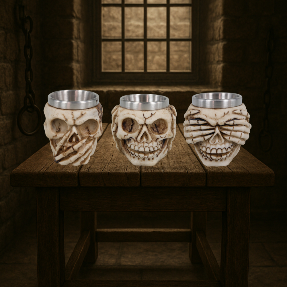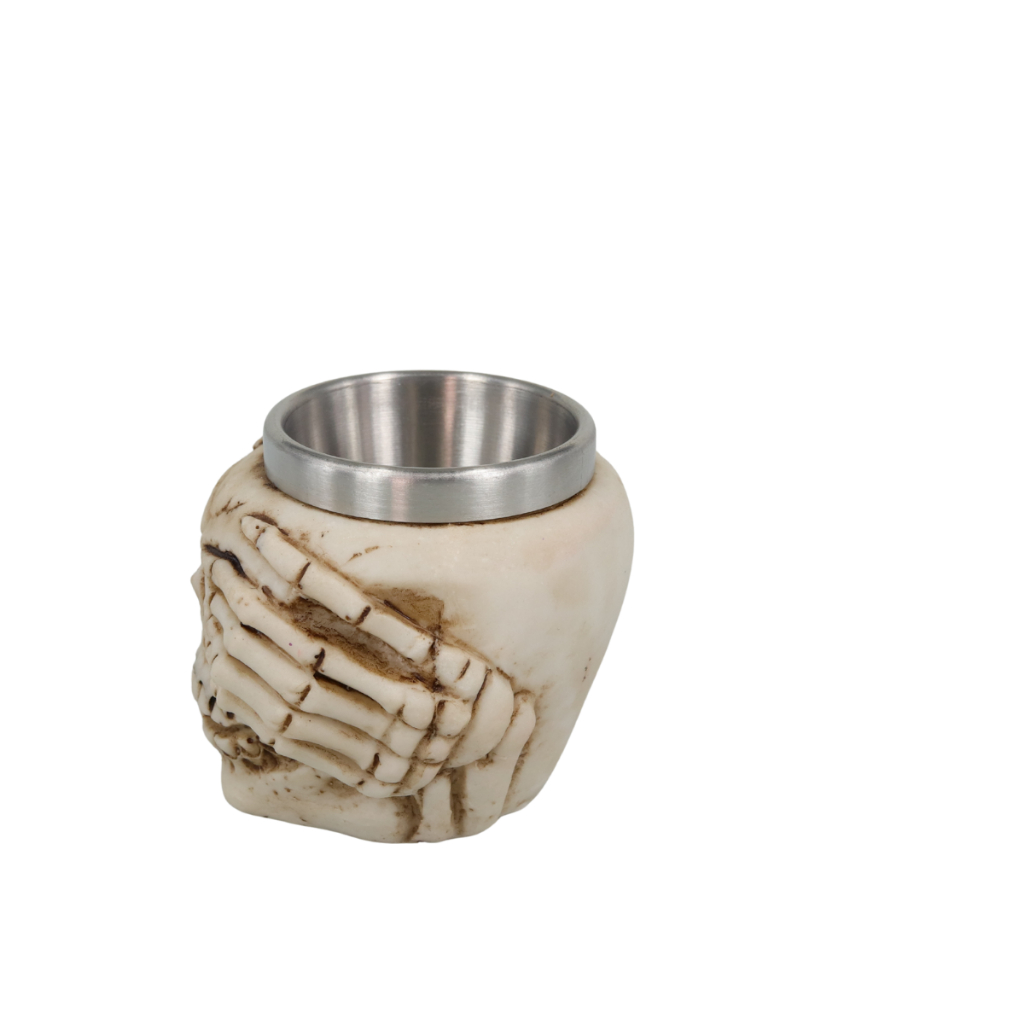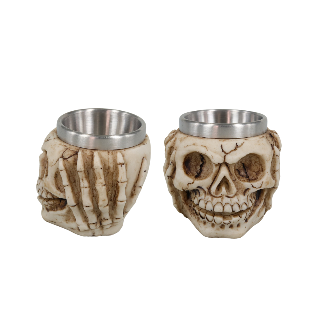 Copo Shot Chopp Inox Medieval Caveira Presente Cega, Surda e Muda 60ml Presente Decorativo