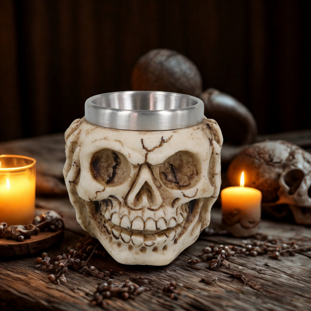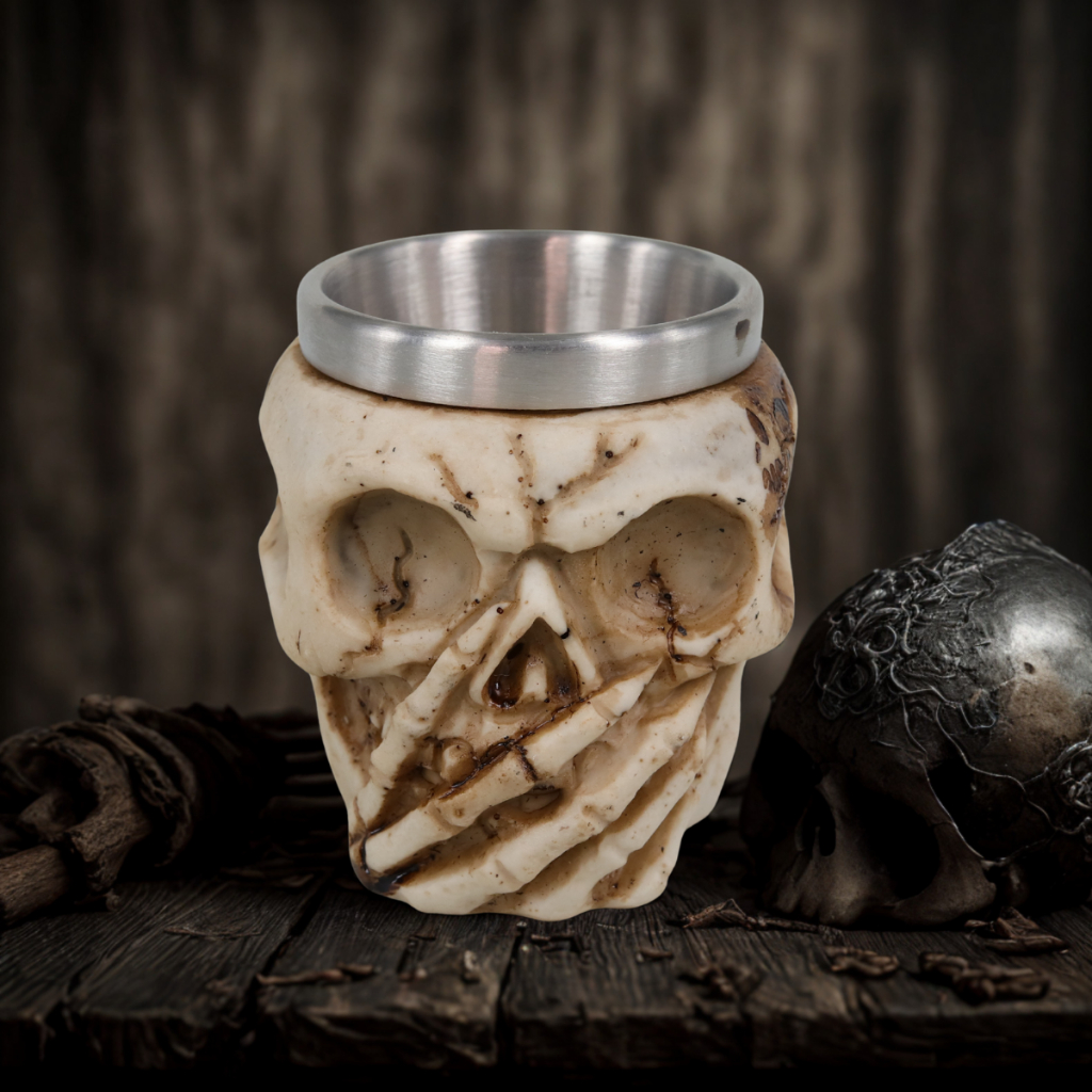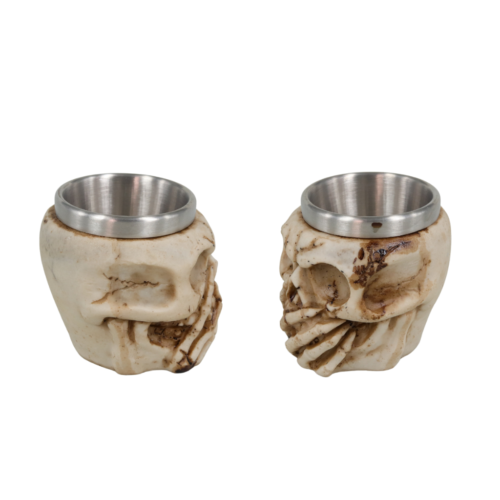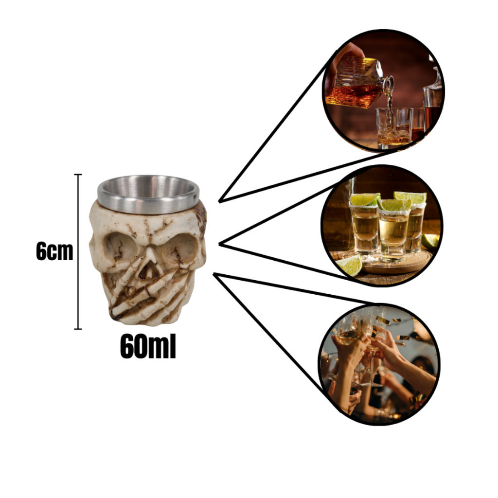 Copo Shot Chopp Inox Medieval Caveira Presente Cega, Surda e Muda 60ml Presente Decorativo