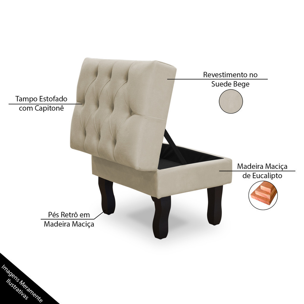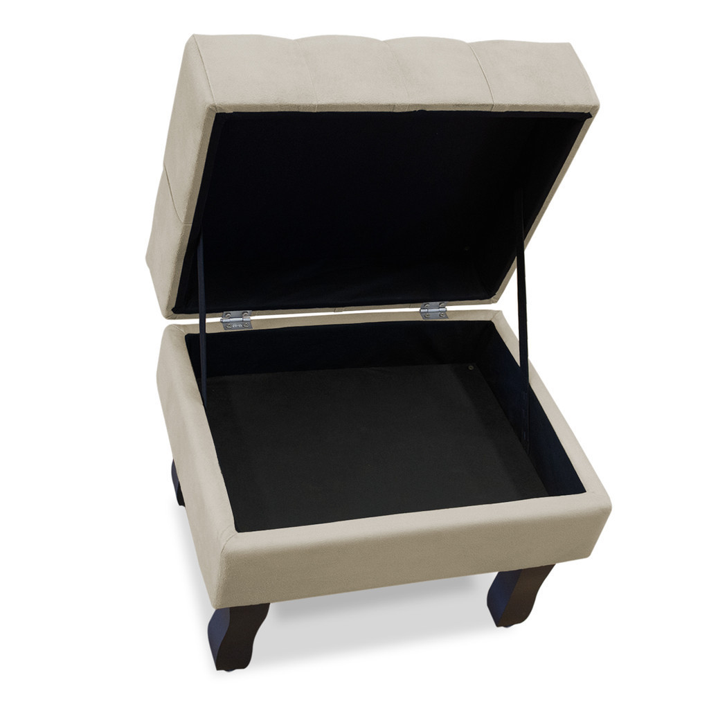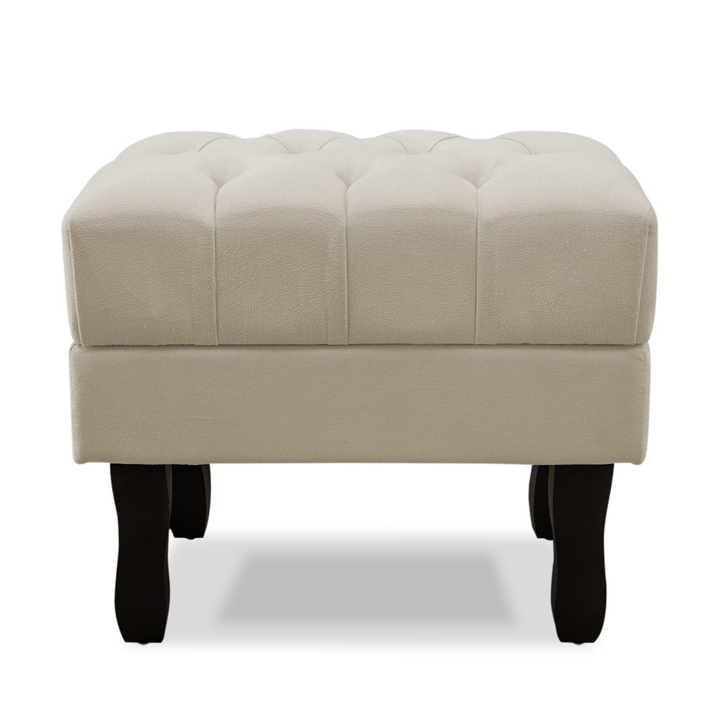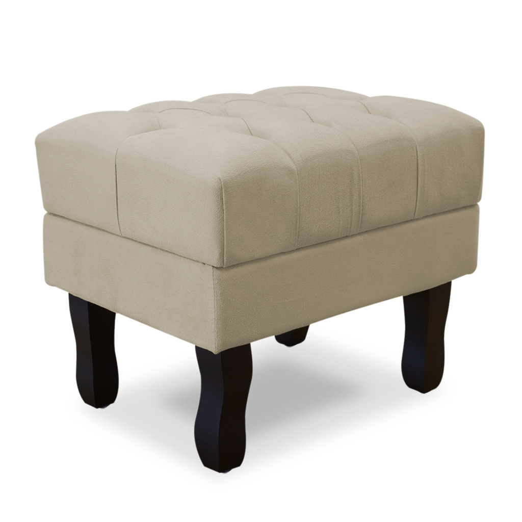Puff Baú Retrô Luis Xv Capitonado, Bege Pés De Madeira