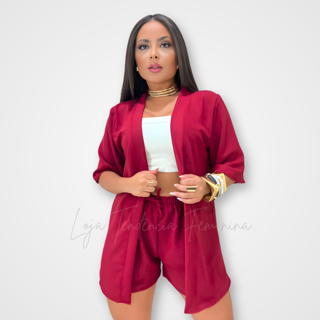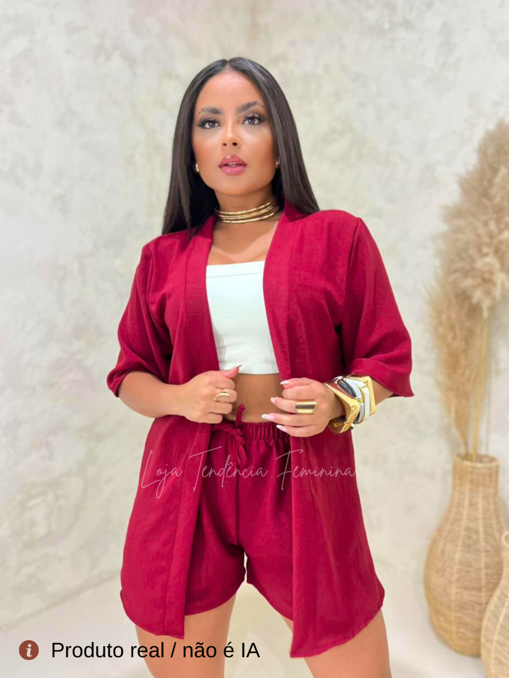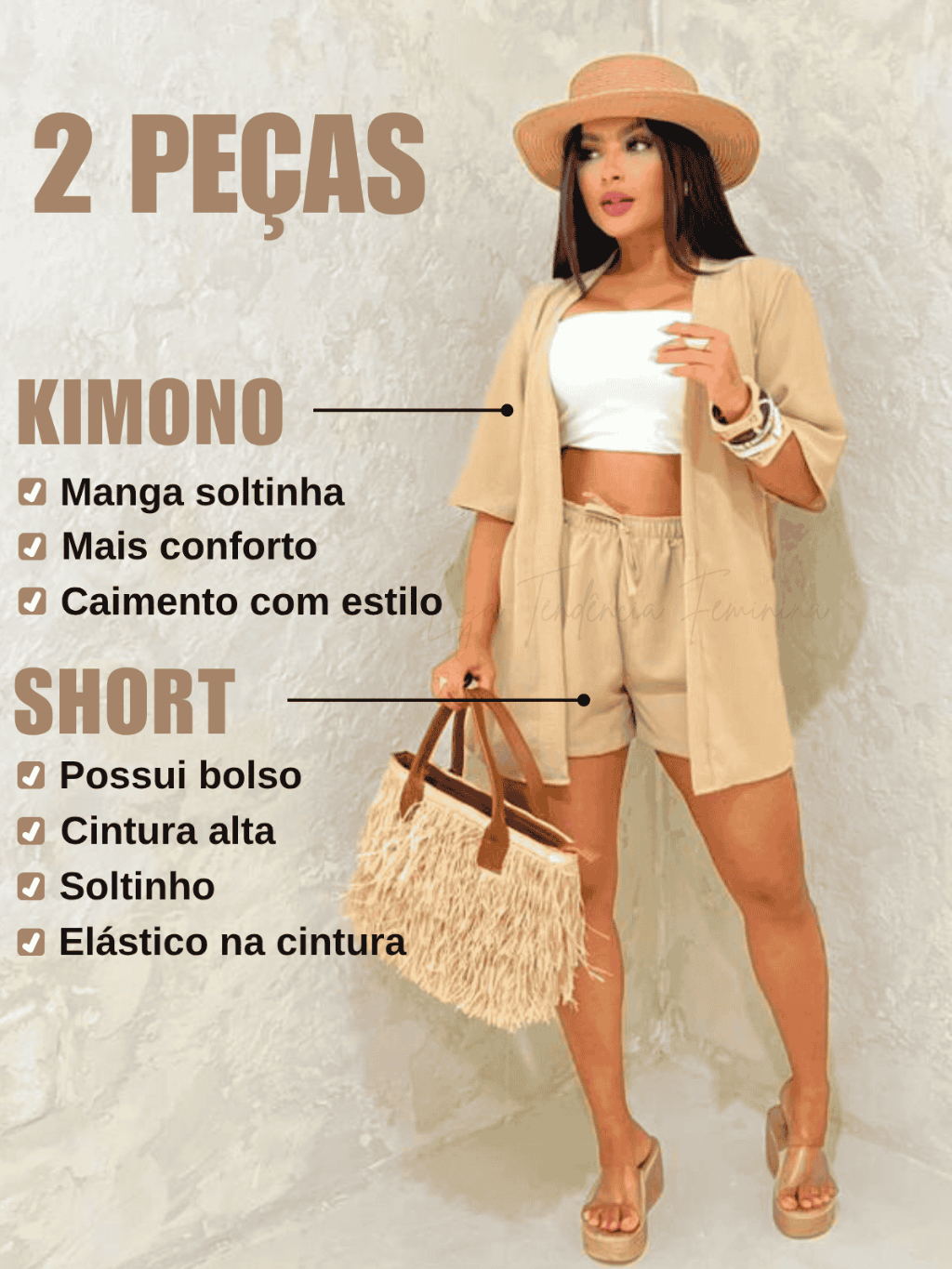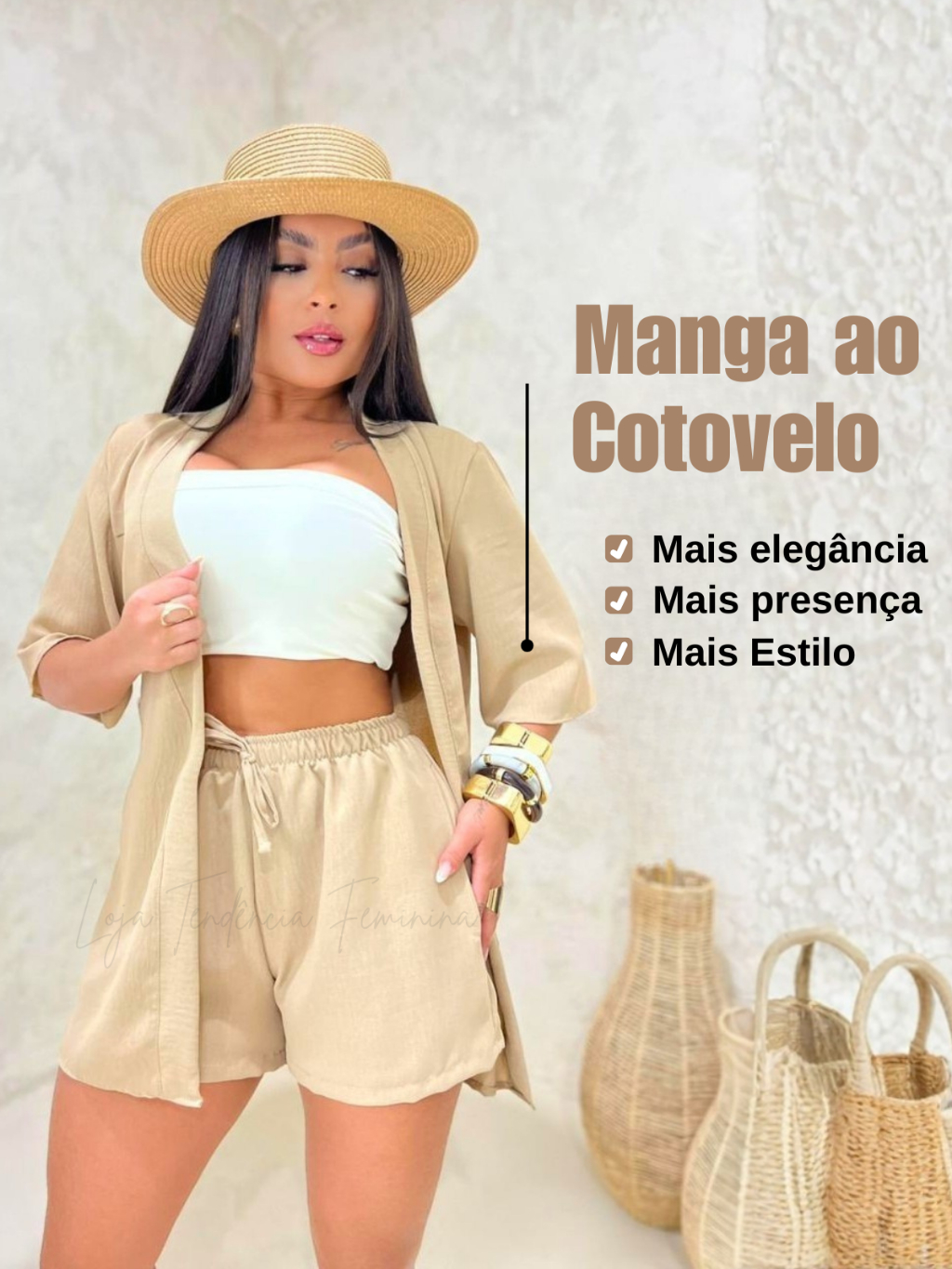 Kimono Cardigan Feminino + Short Cintura Alta Duna Conjunto 2 Peças não Amassa Tendência 2026