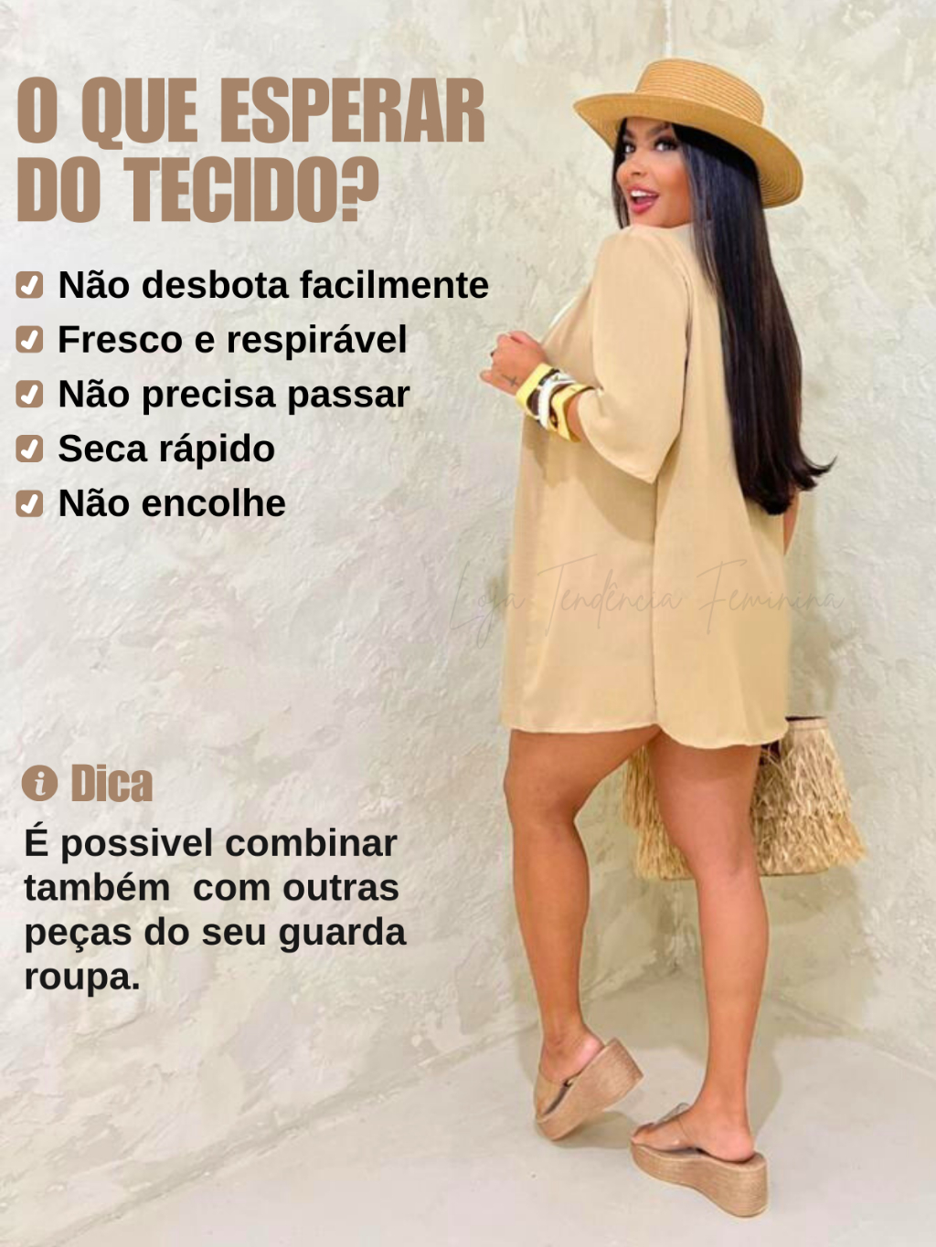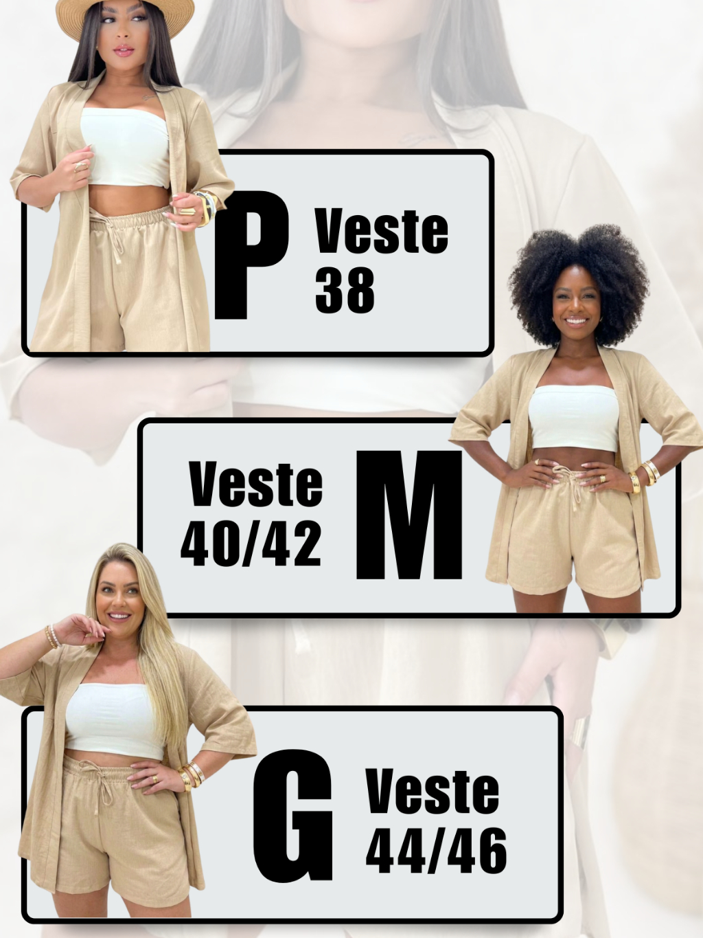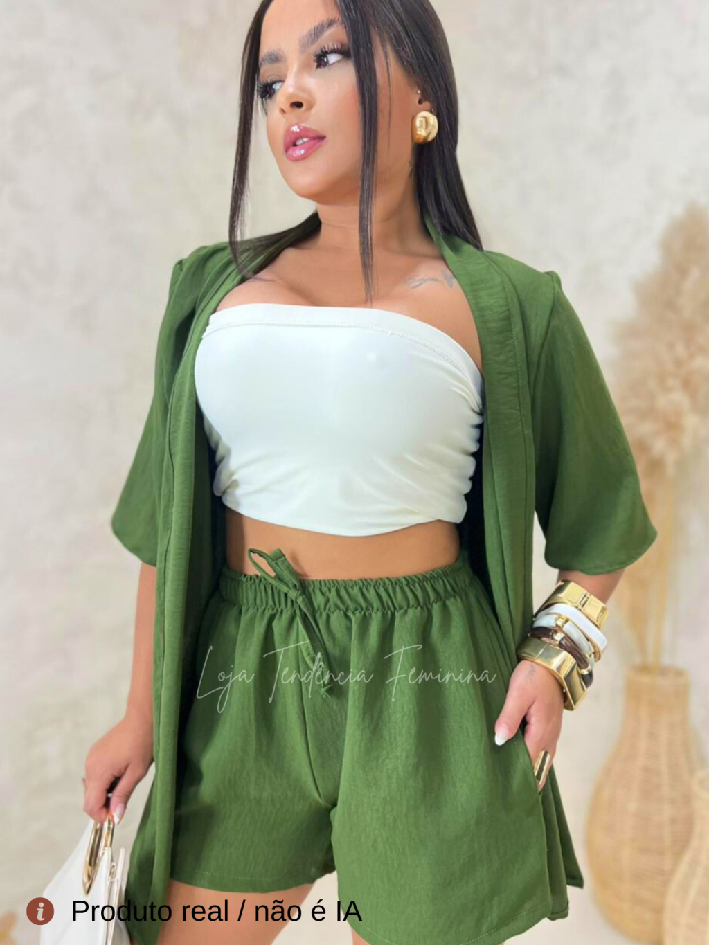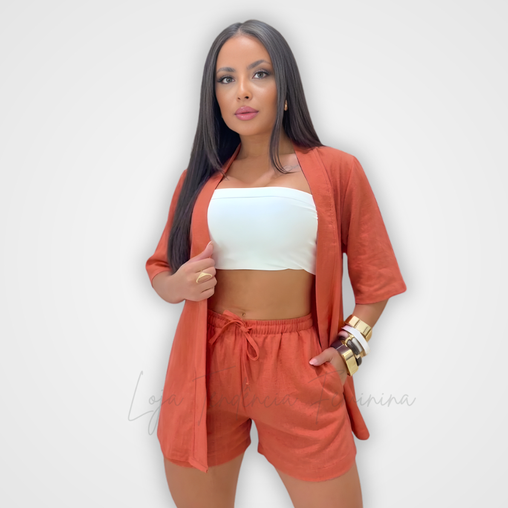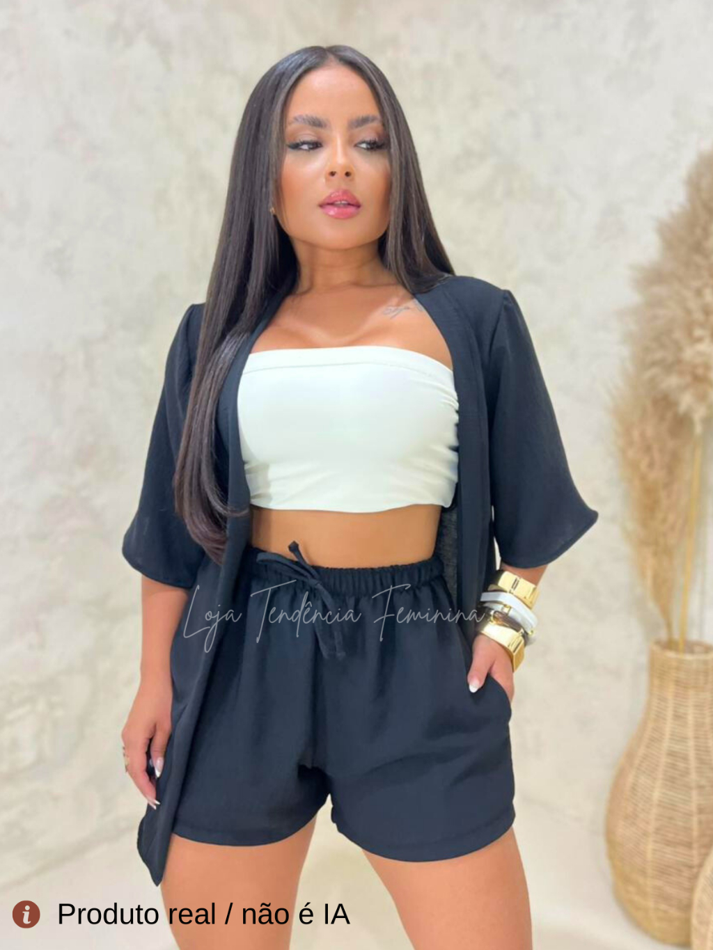 Kimono Cardigan Feminino + Short Cintura Alta Duna Conjunto 2 Peças não Amassa Tendência 2026