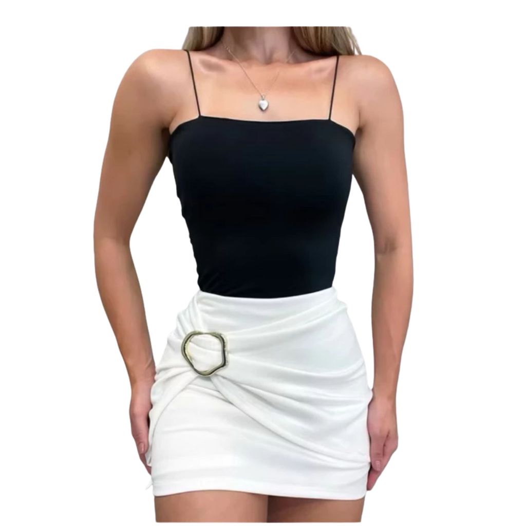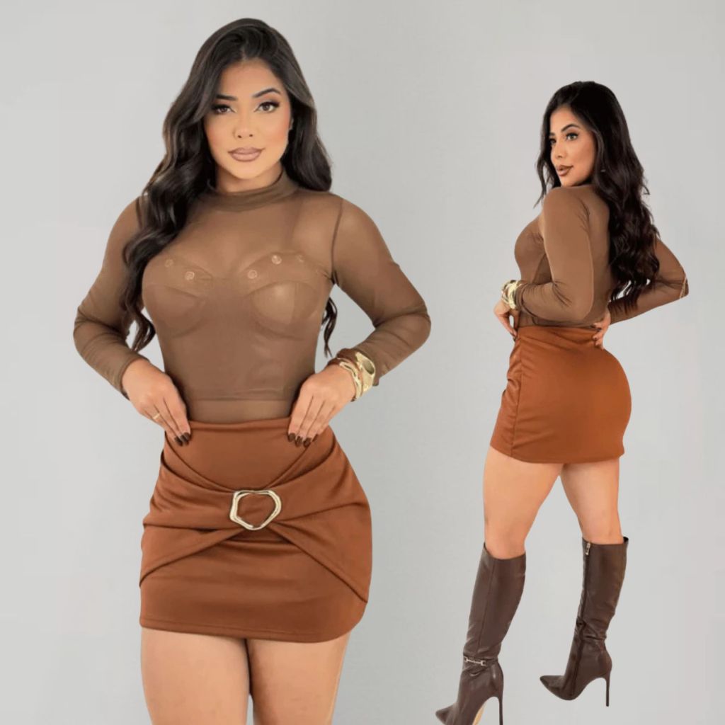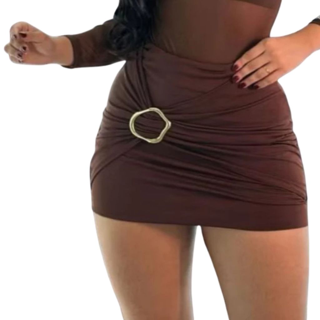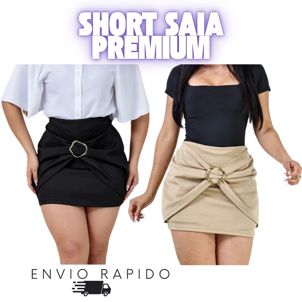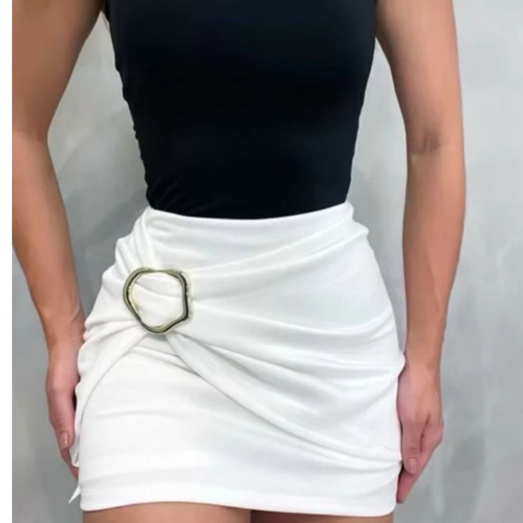 Short Saia Feminino Estiloso Alfaiataria Premium Neoprene Cintura Alta com Detalhe de Fivela Dourada
