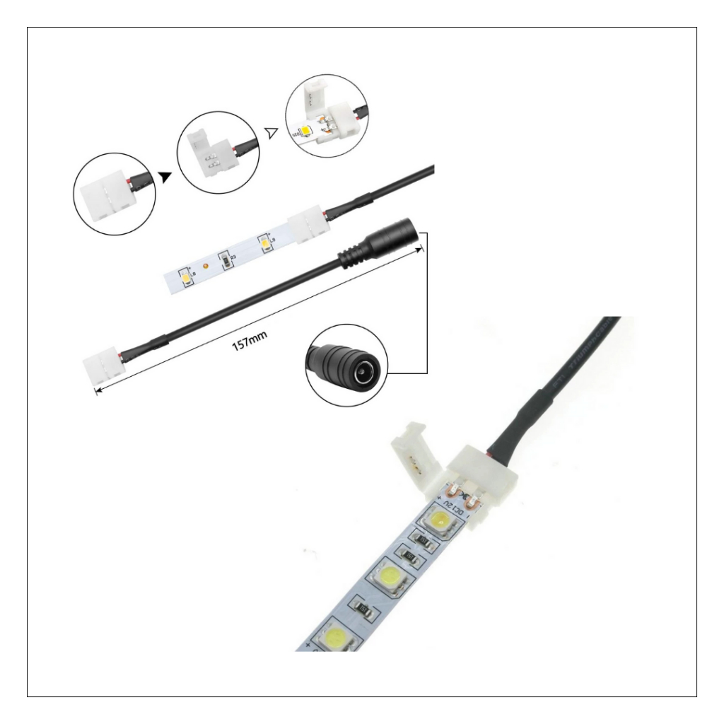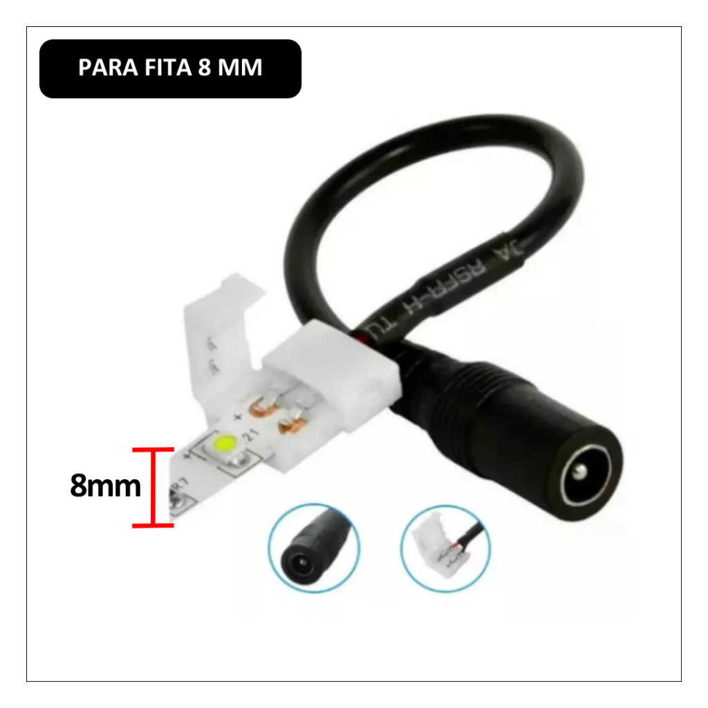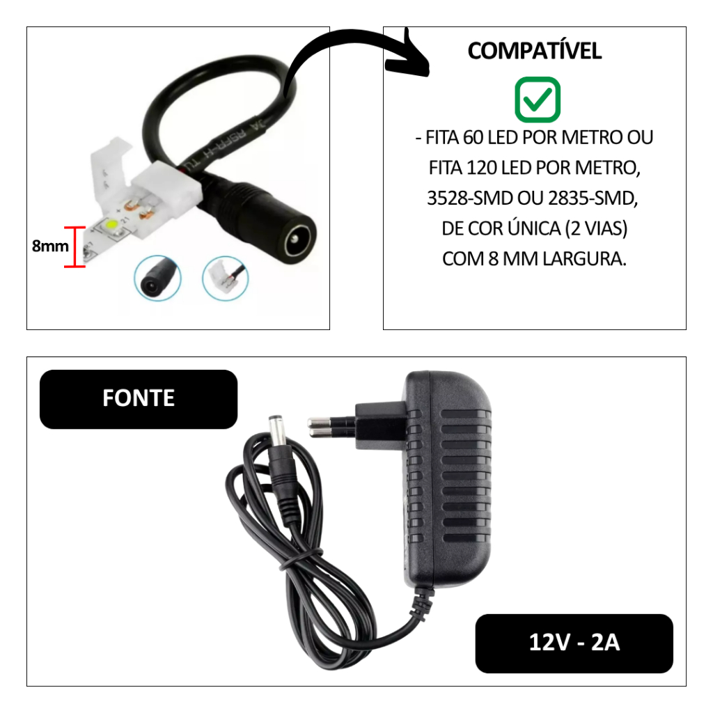 Cabo Conector Emenda 8mm Fita LED 2 Vias 3528 Ou 2835 Com Plug P4 + Fonte 12V Bivolt