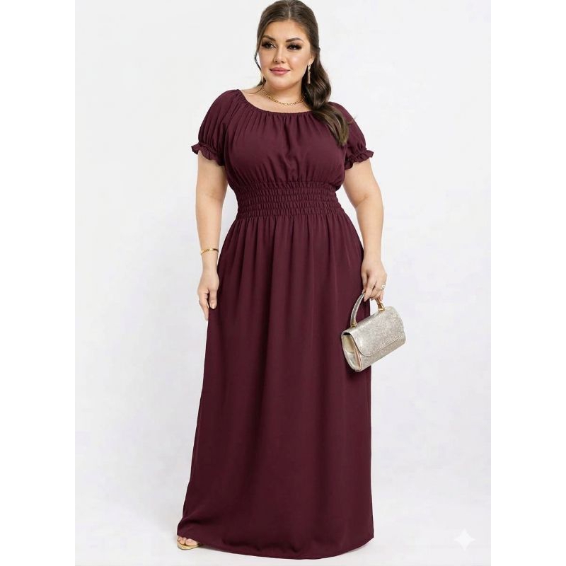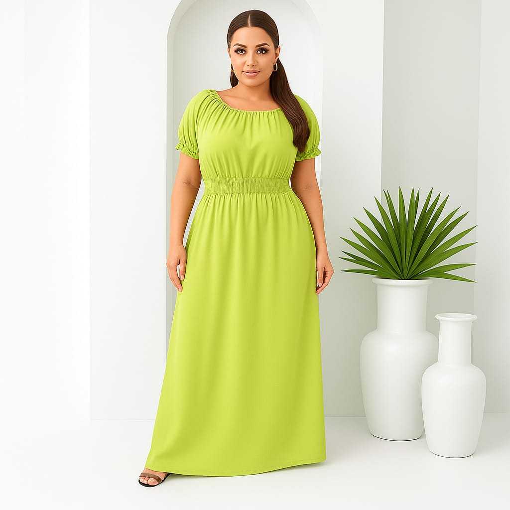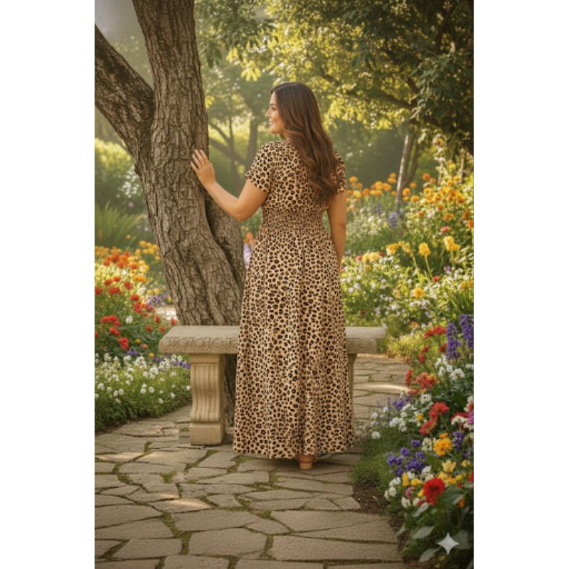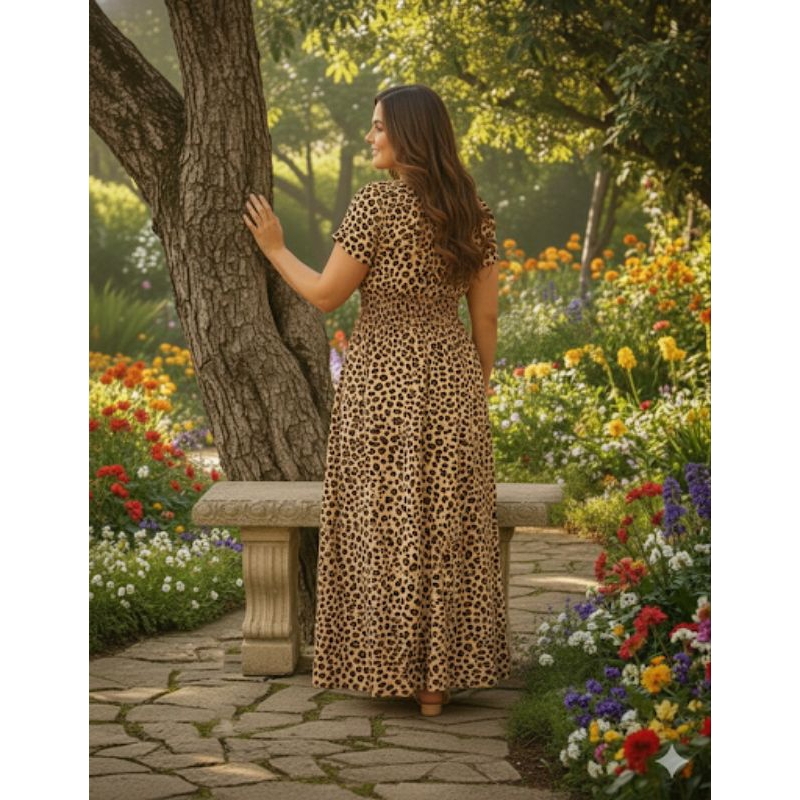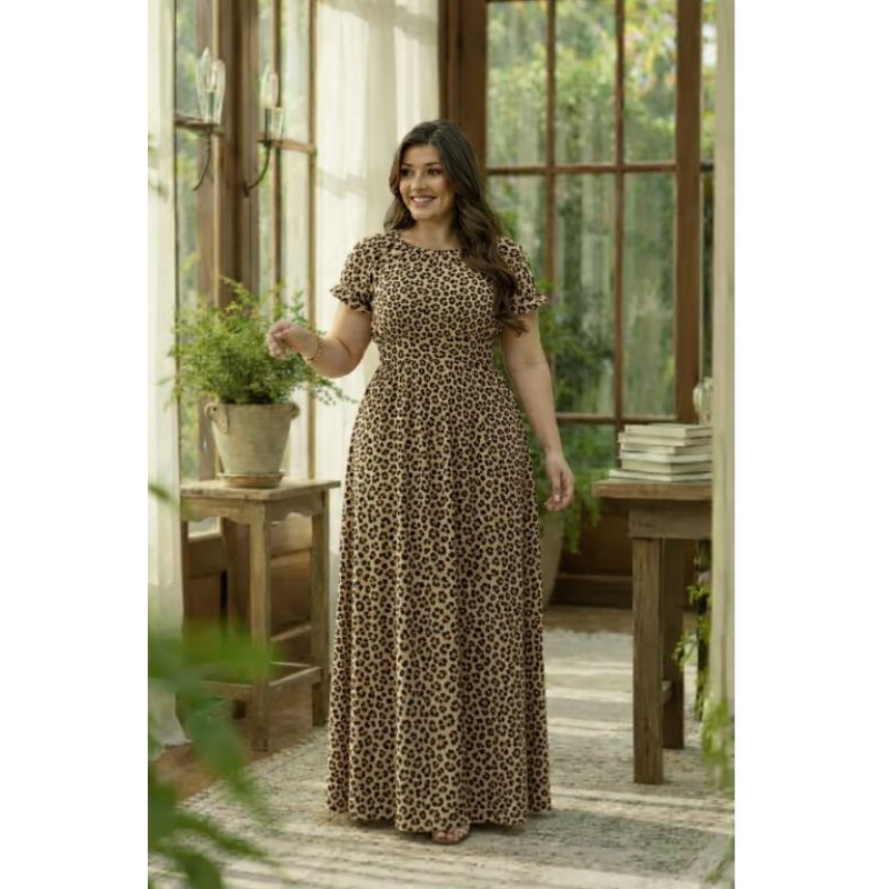 Vestido Feminino Longo Plus zece Manga Curta Estampado Oncinha Elegante.