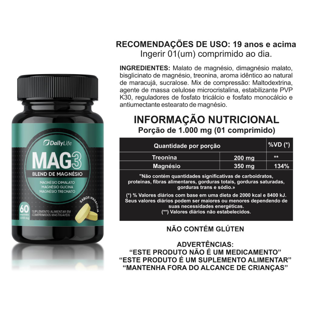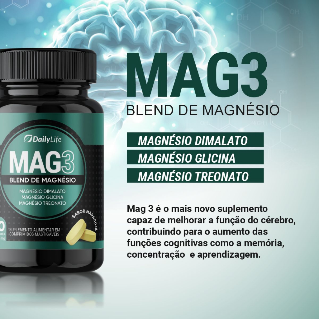 Kit 3x Mag3 DailyLife Treonato De Magnésio 60 Comprimidos Mastigáveis