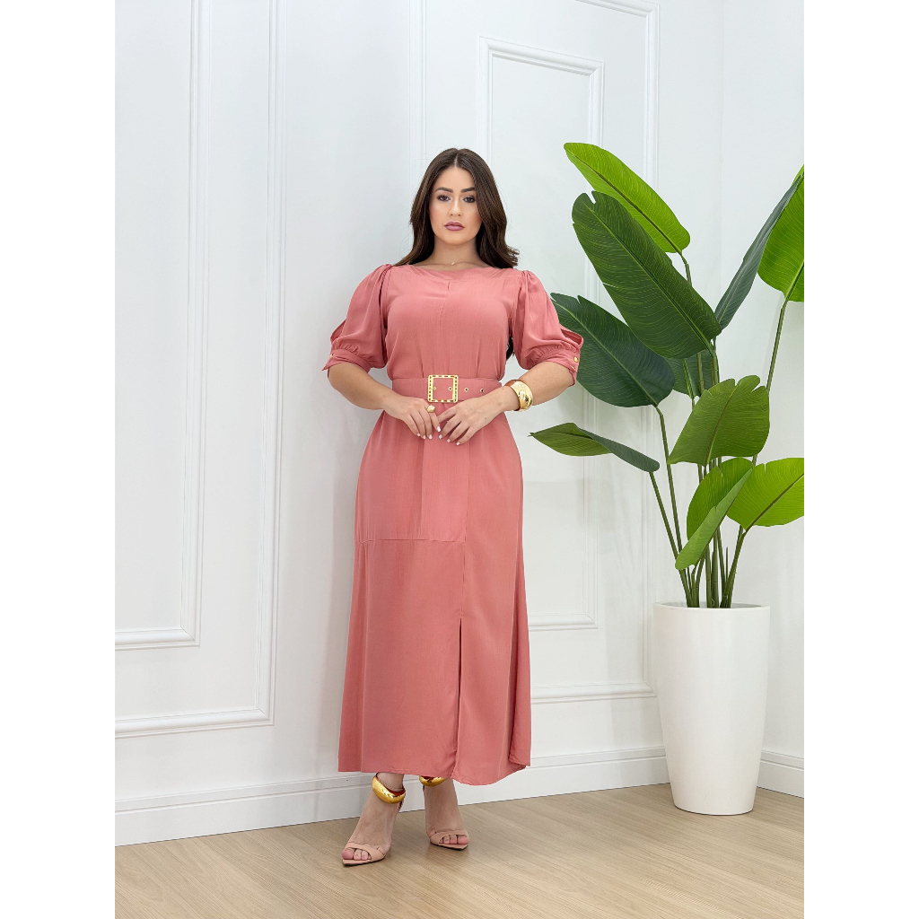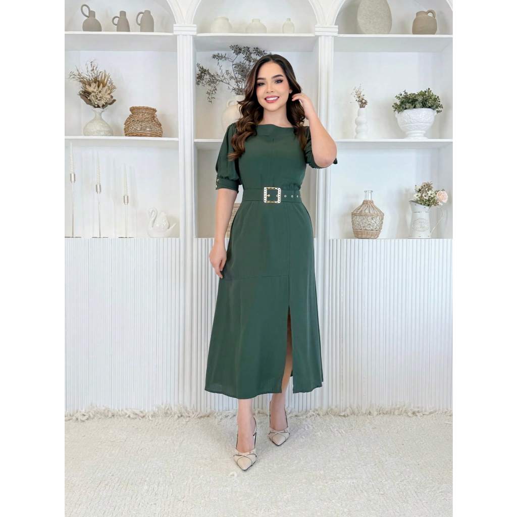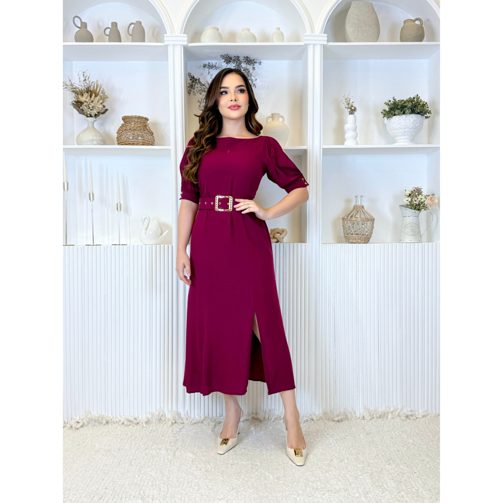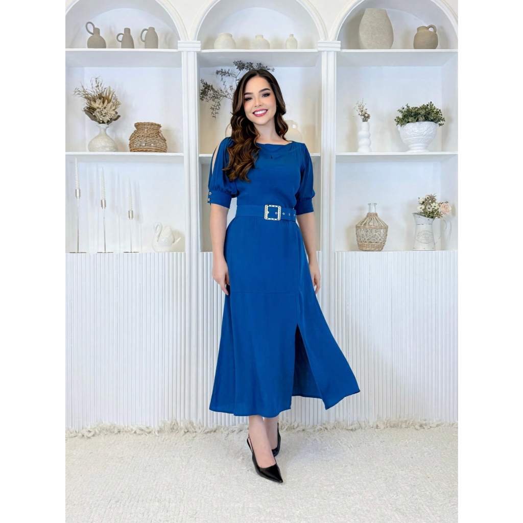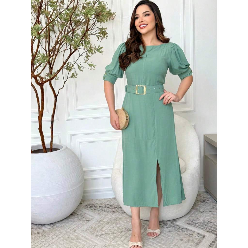 Vestido Feminino Moda Evangélica Elegante Com Cinto Ajustável Abertura Na Manga E Fenda