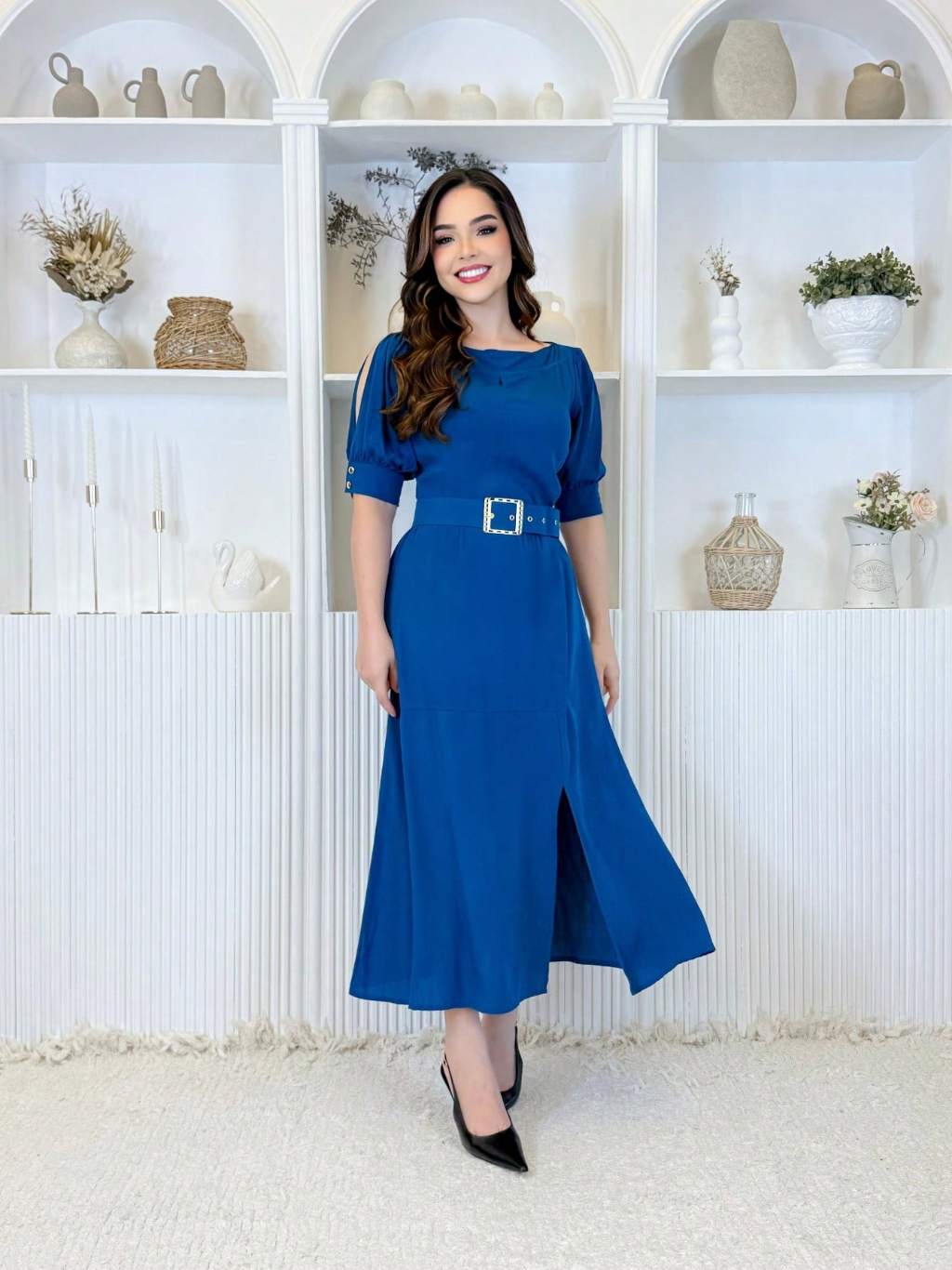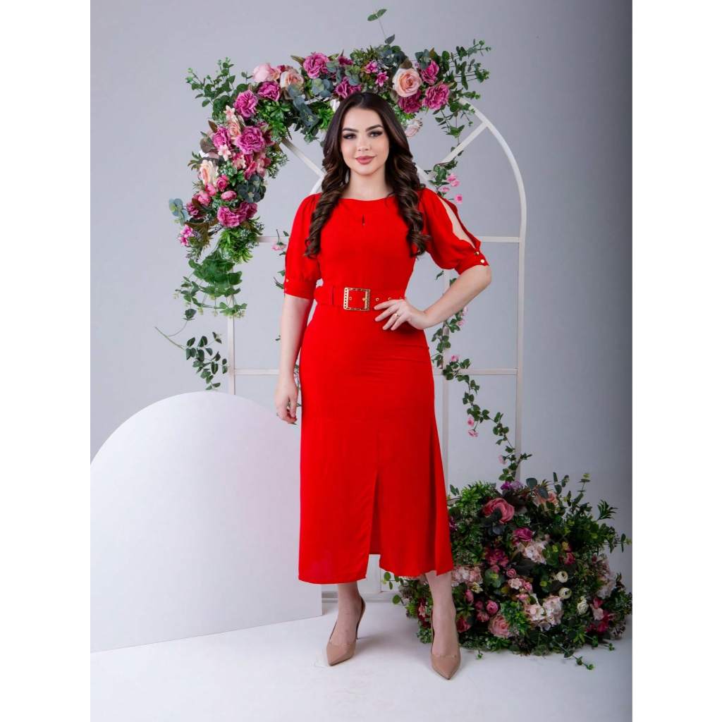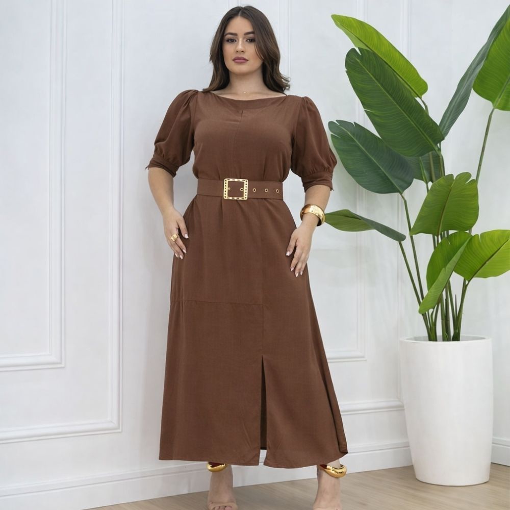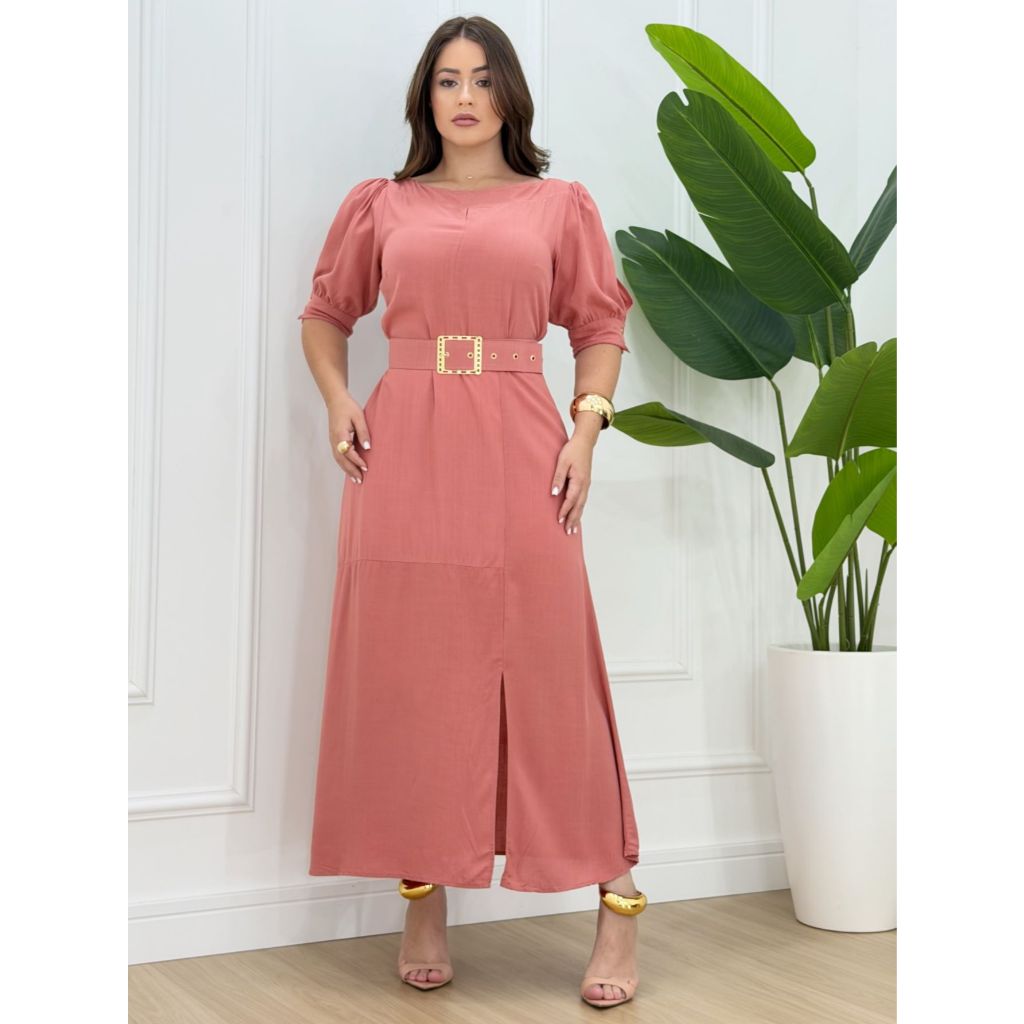 Vestido Feminino Moda Evangélica Elegante Com Cinto Ajustável Abertura Na Manga E Fenda