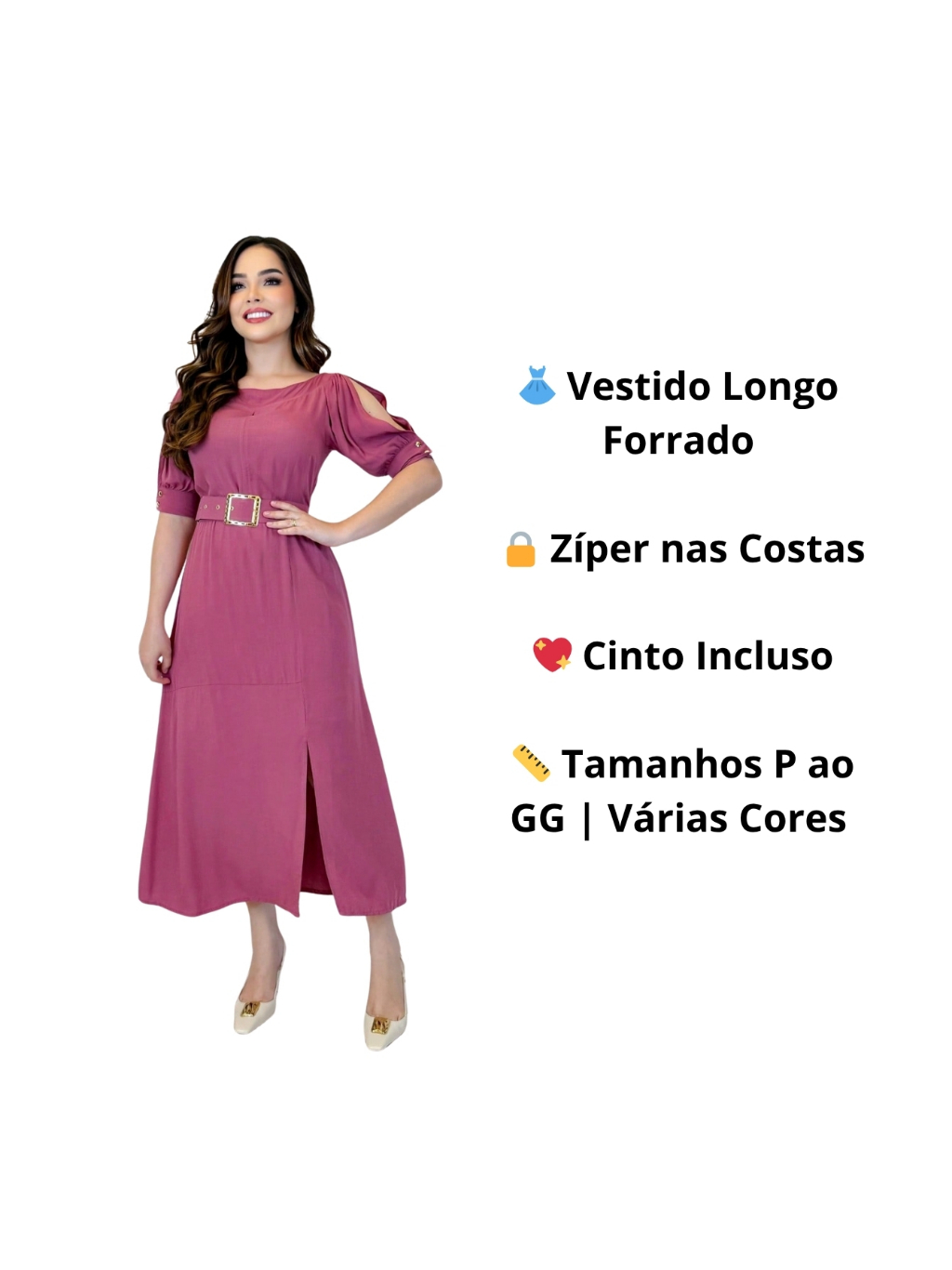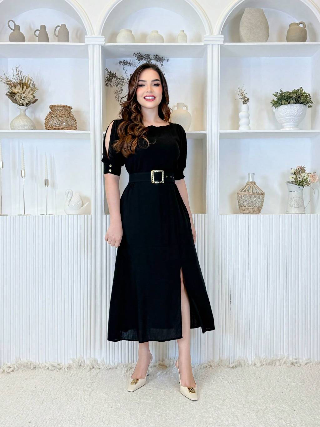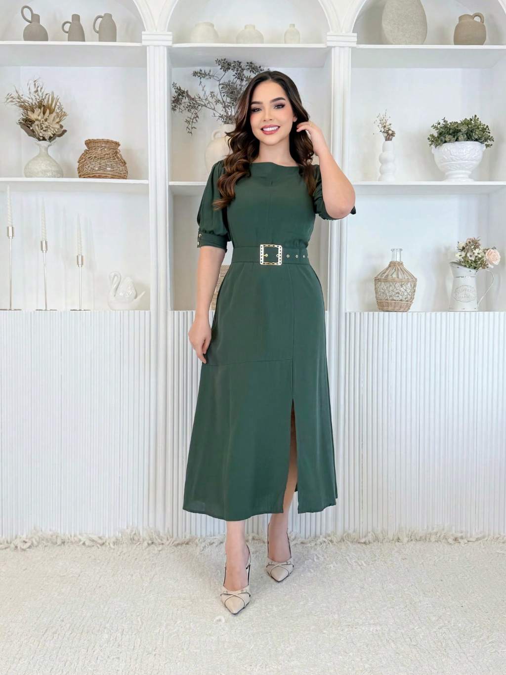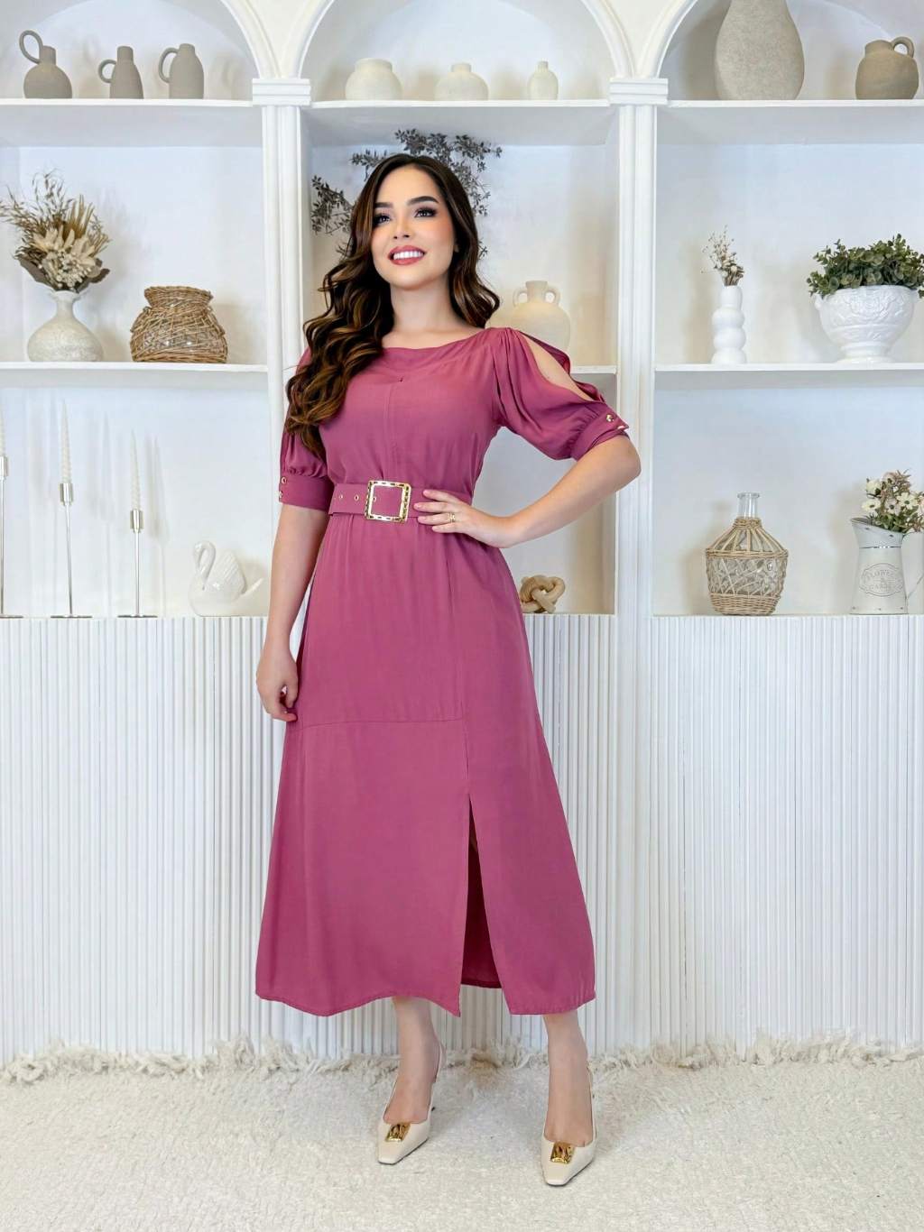 Vestido Feminino Moda Evangélica Elegante Com Cinto Ajustável Abertura Na Manga E Fenda