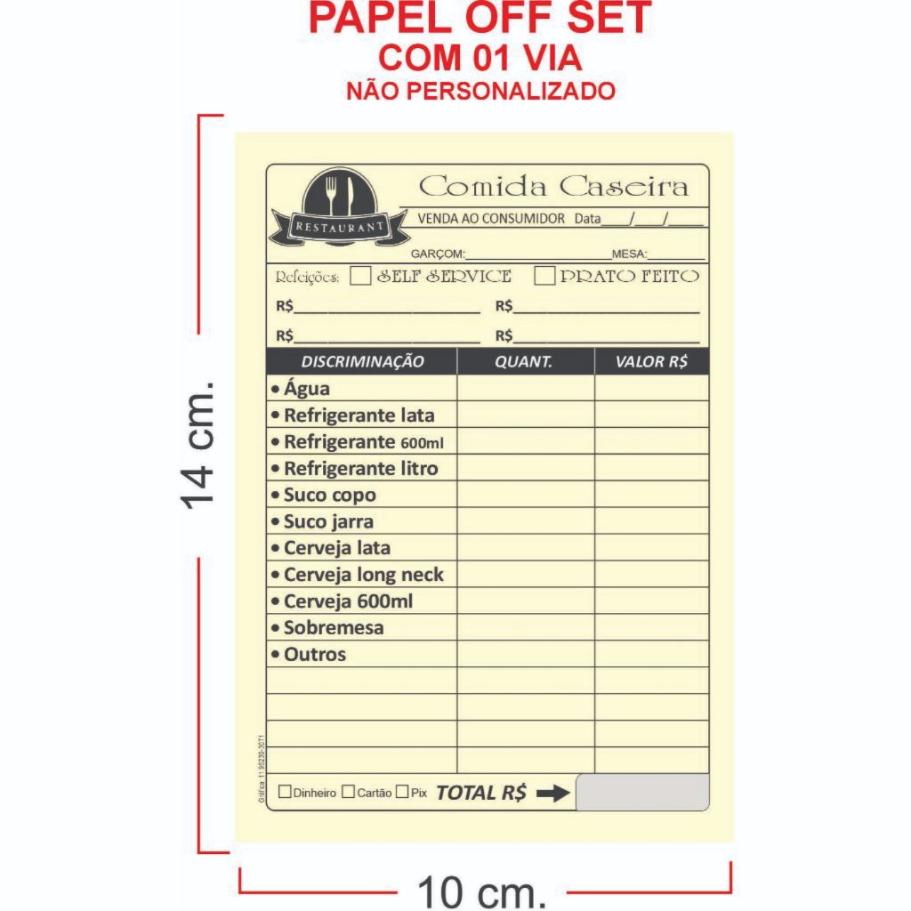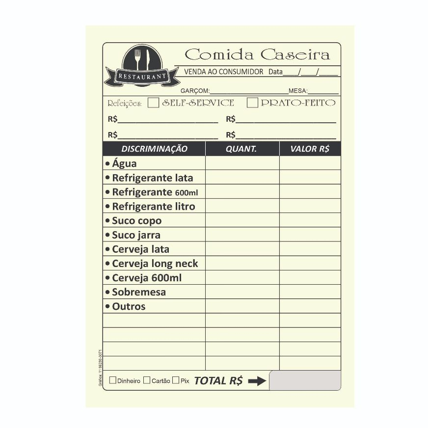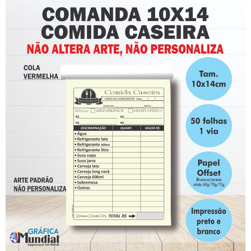 Comanda Comida Caseira 10x14, 50 folhas cada bloco Lanchonete Barzinho Restaurante Papelaria Anotações