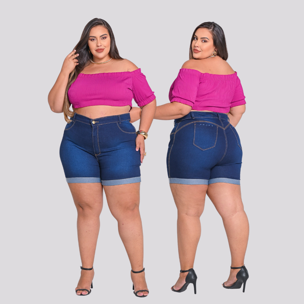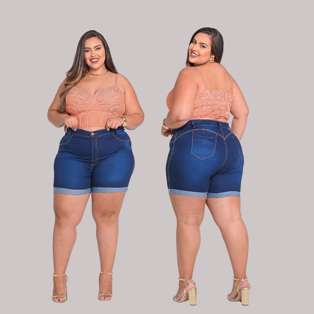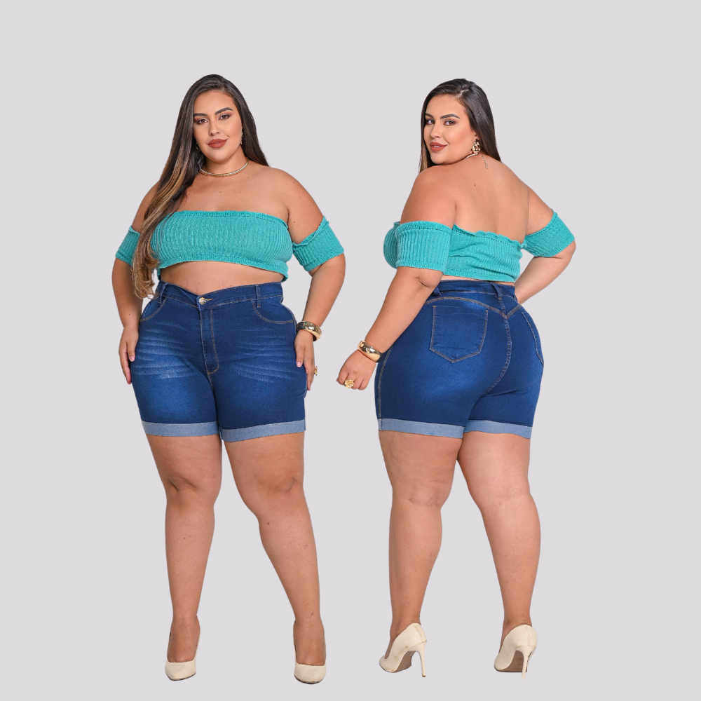 Bermuda Meia Coxa jeans feminina plus size elastano premium cintura alta lycra strech curve