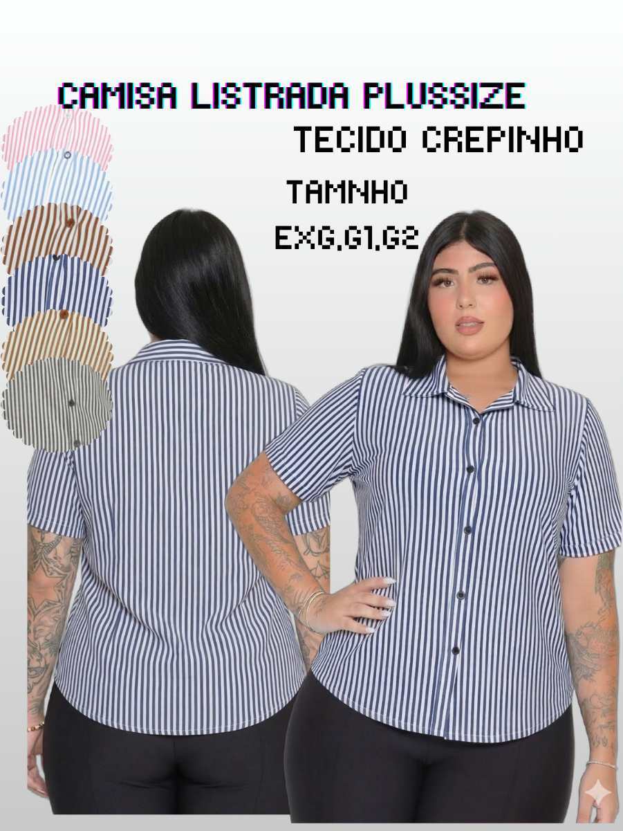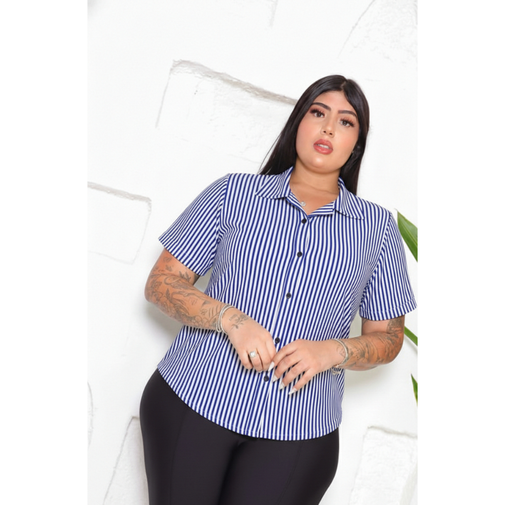 CAMISA FEMININA CASUAL ,LISTRADA PLUSSIZE MANGA CURTA TECIDO CREPINHO