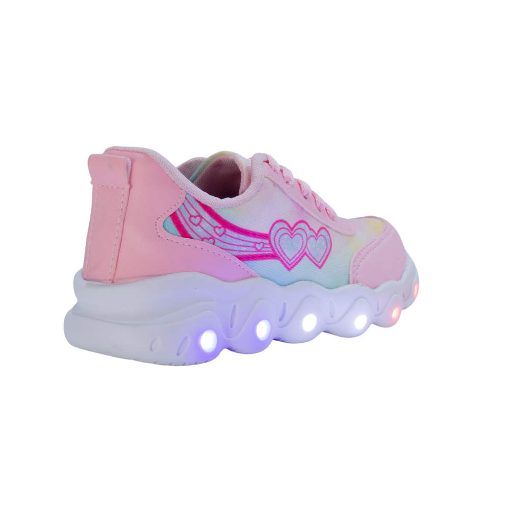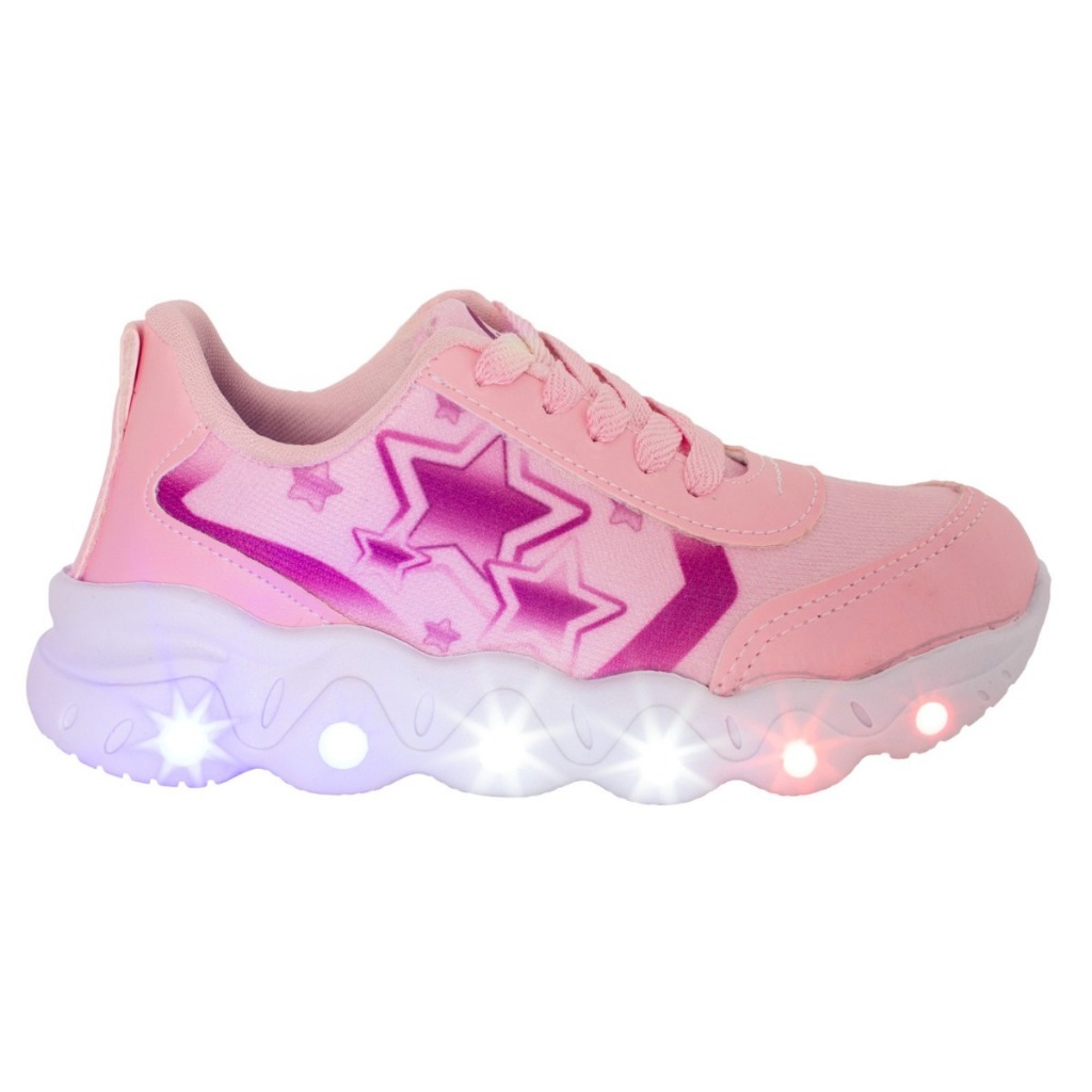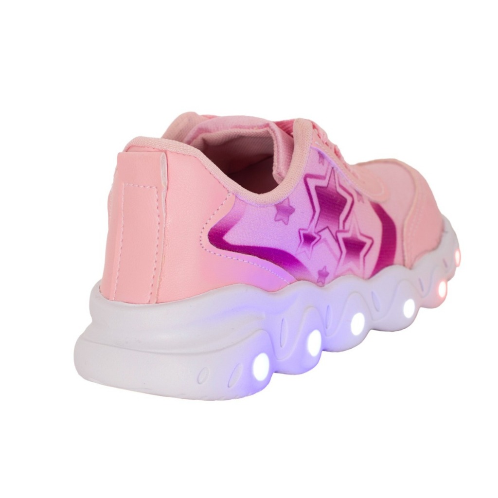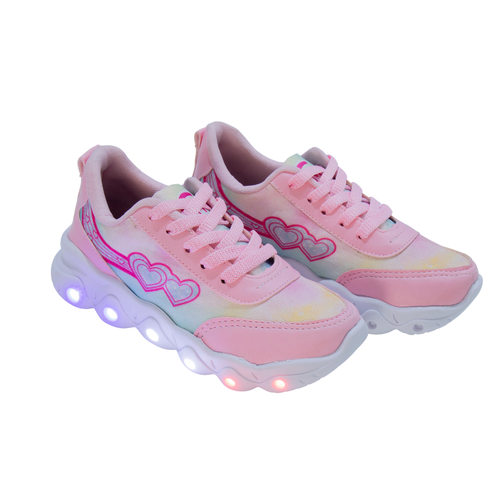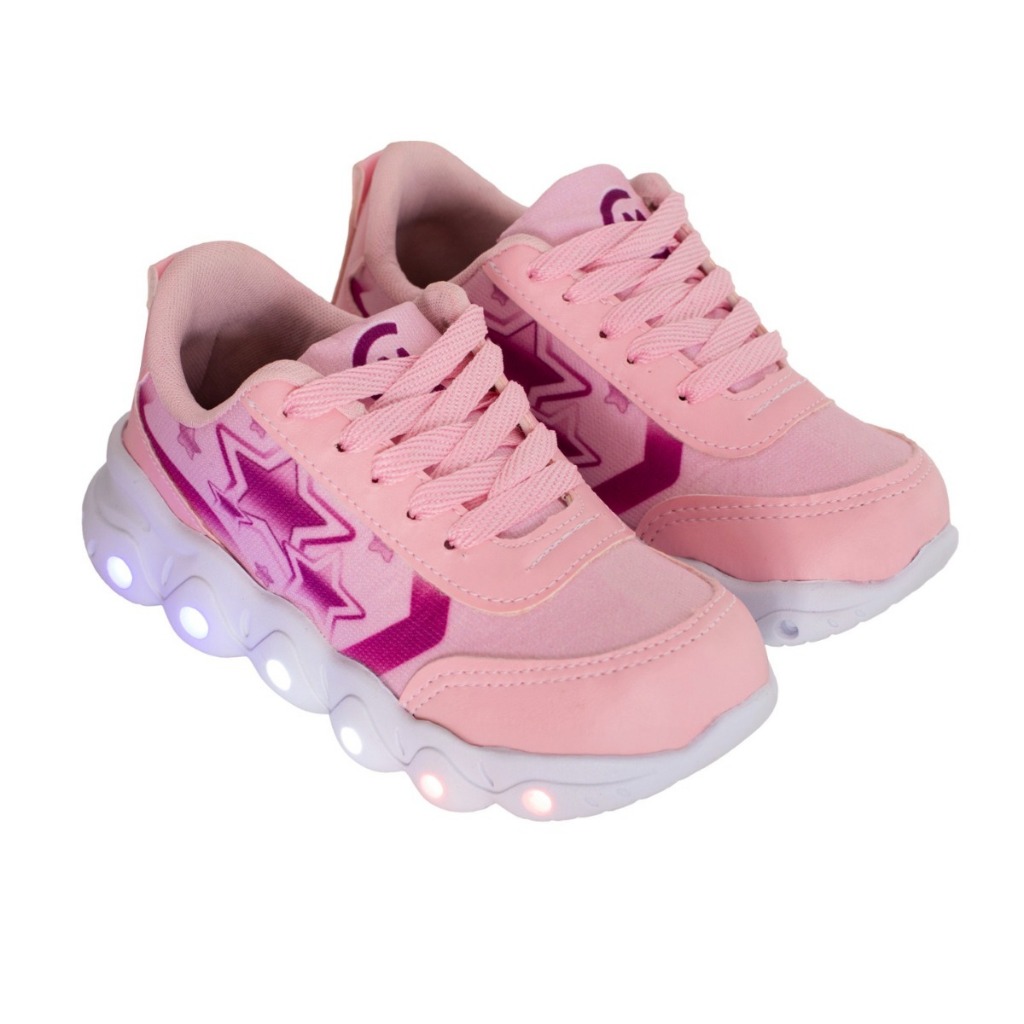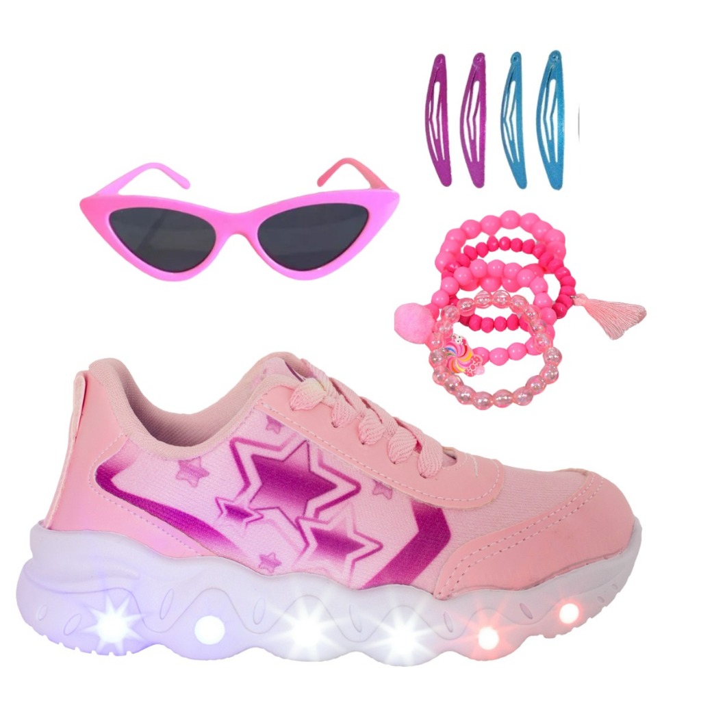 Tênis Led Infantil Feminino Estrela Coração Casual Jogging Escolar Rosa + Óculos Tictac Pulseira