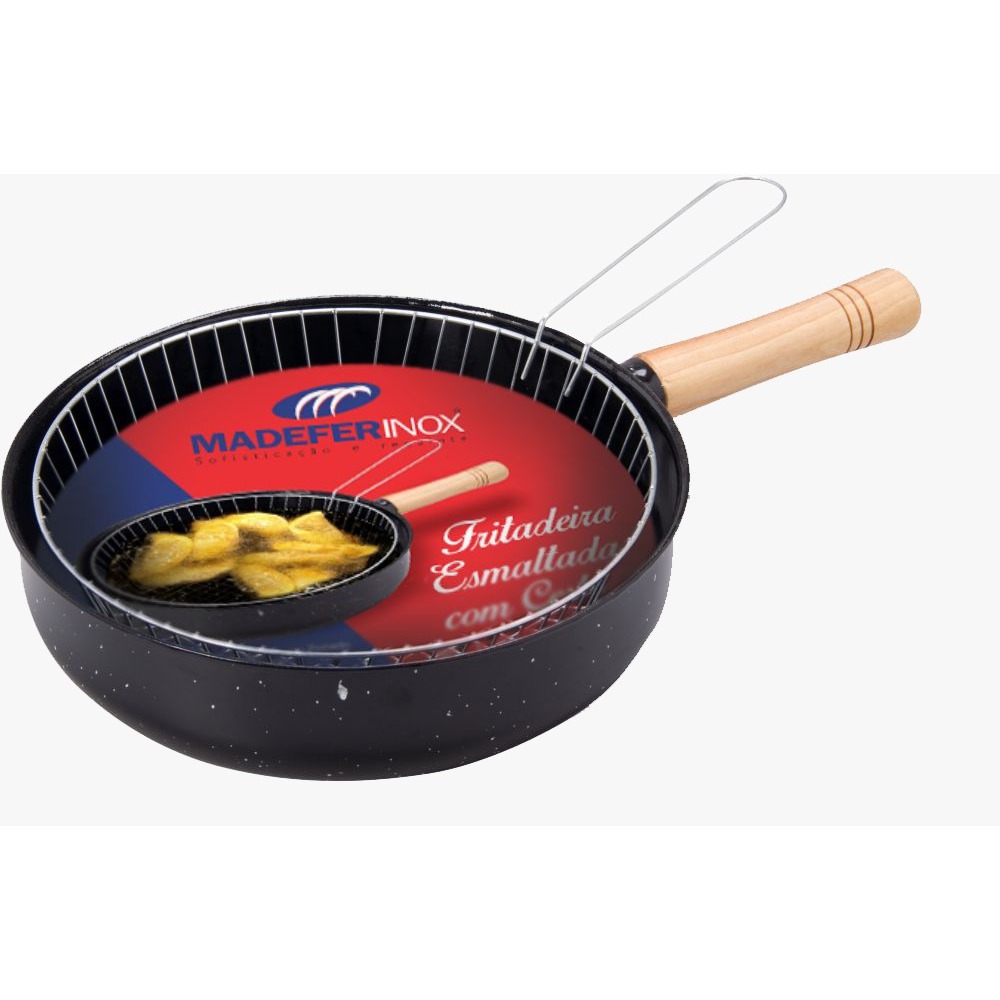 FRITADEIRA ESMALTADA 22 CM COM CESTO ZINCADO CABO DE MADEIRA