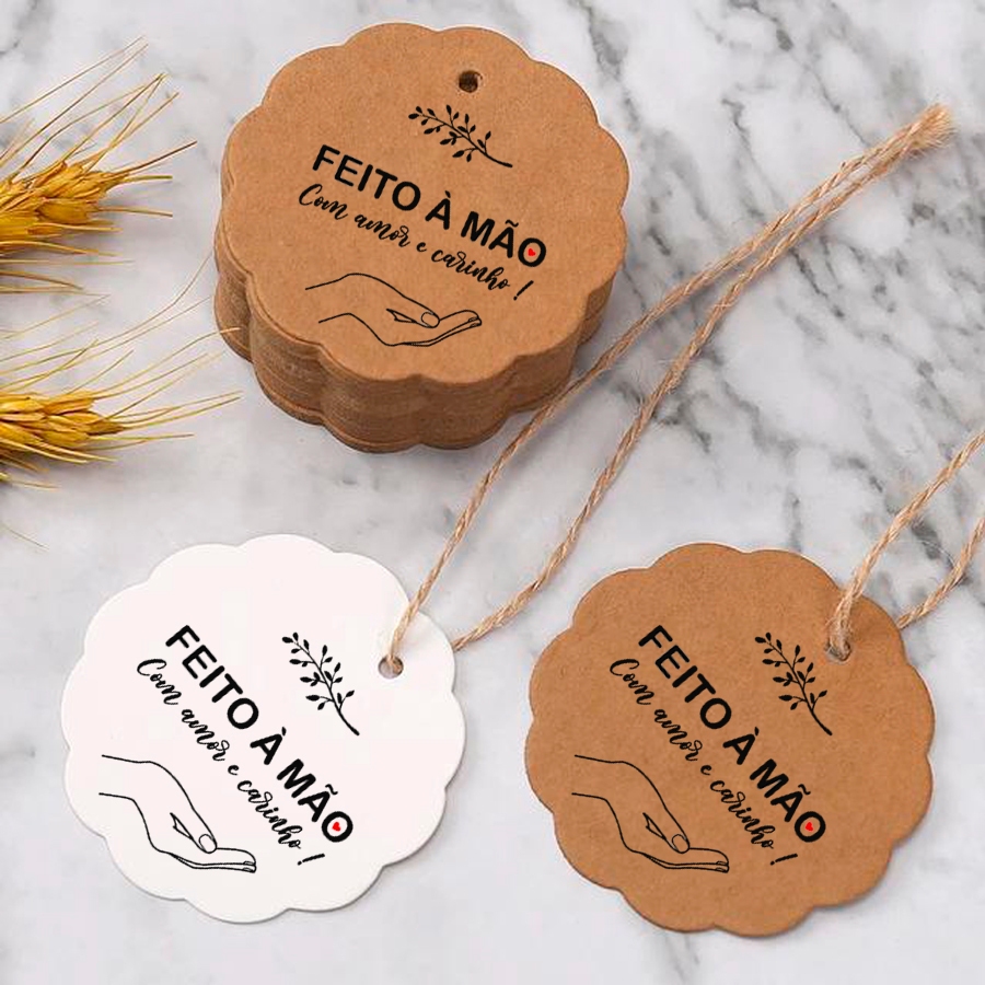 Tags de Papel kraft Impresso com a Frase Feito À Mão - com fio de juta - 6x6 cm