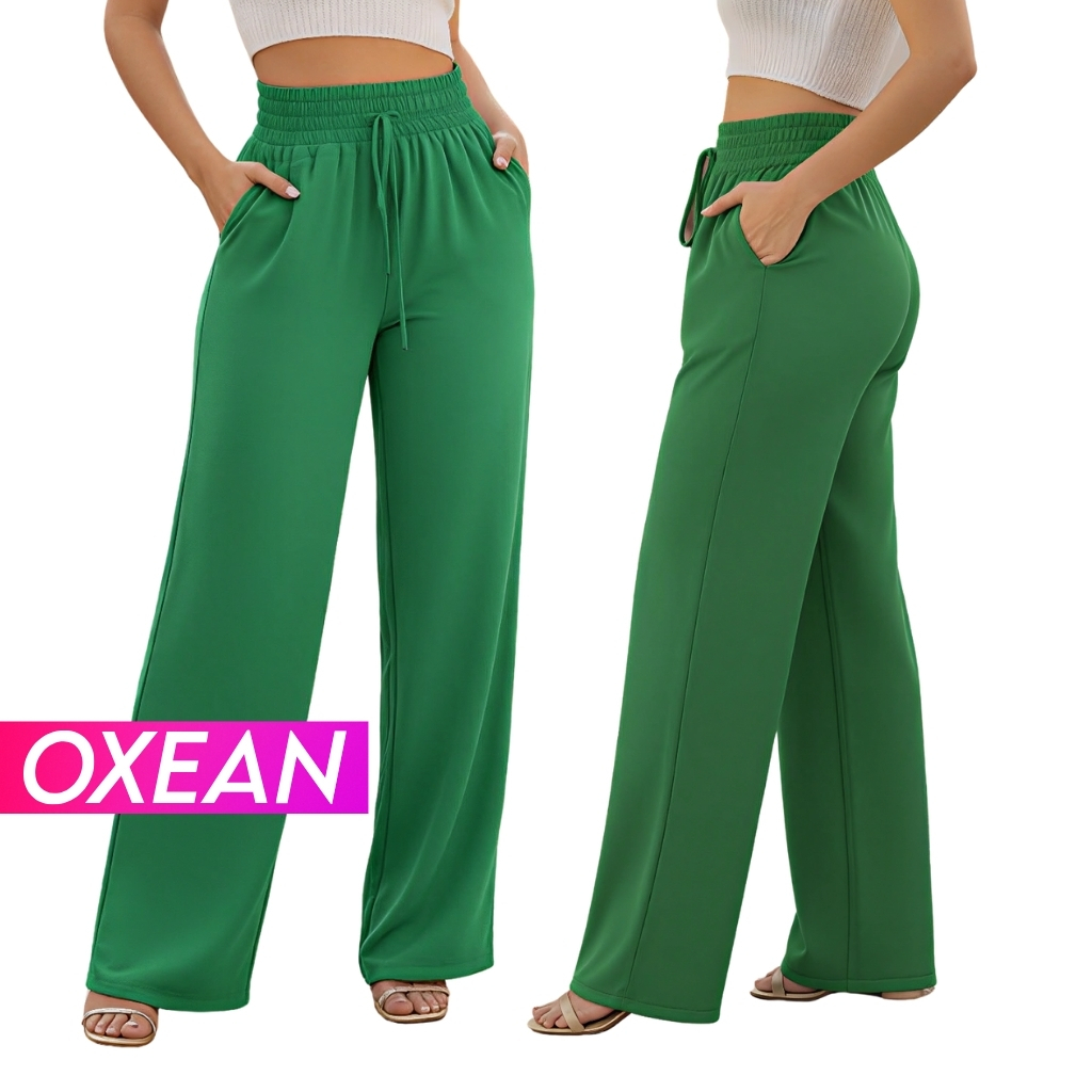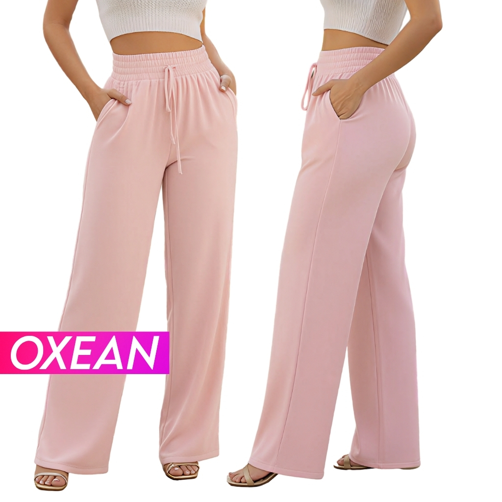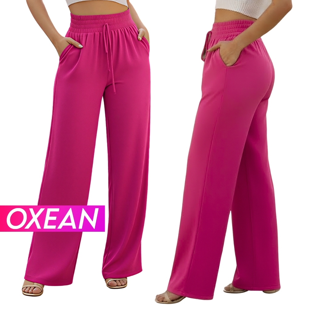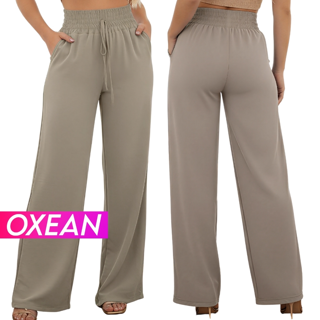 Calça Pantalona Feminina Elástico Na Cintura Com Bolso Cintura Alta Tecido Duna