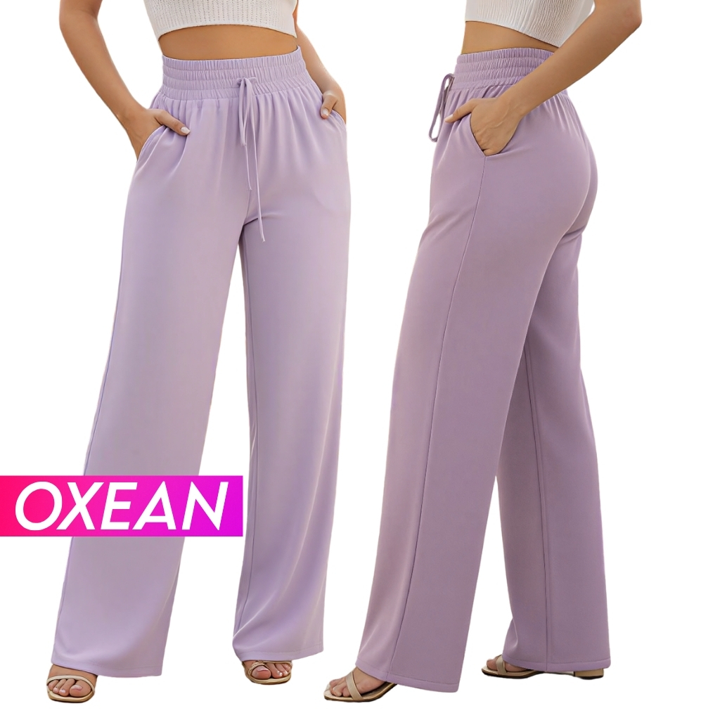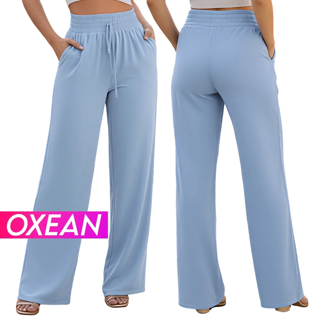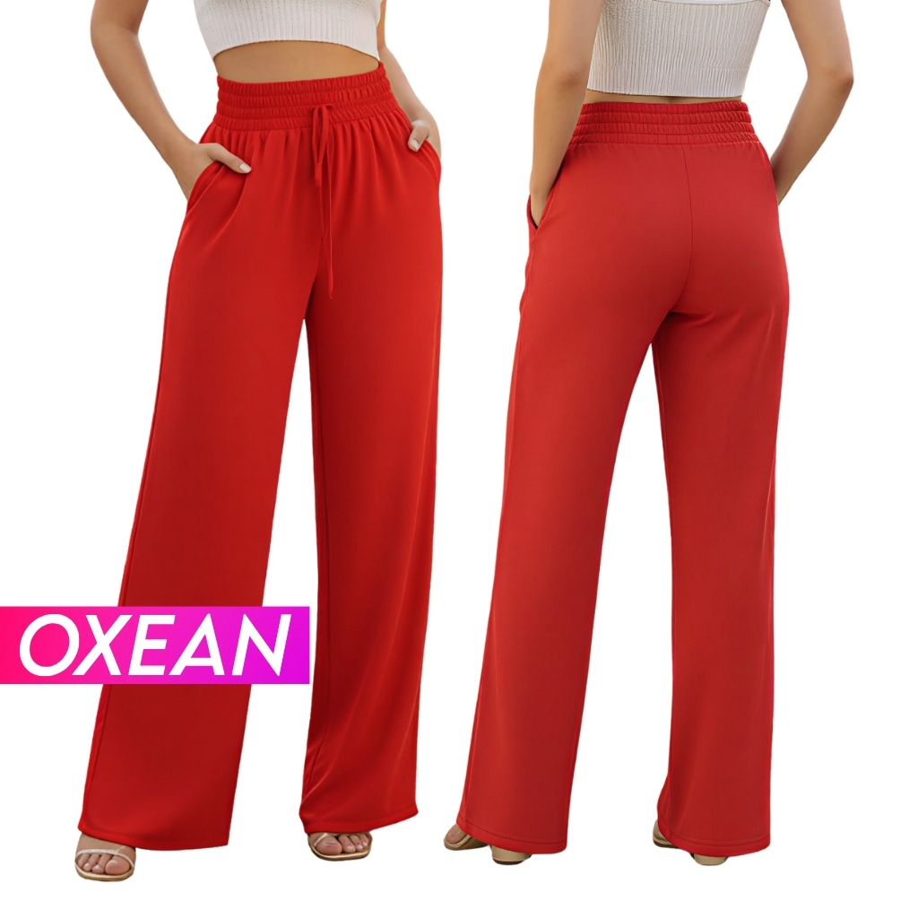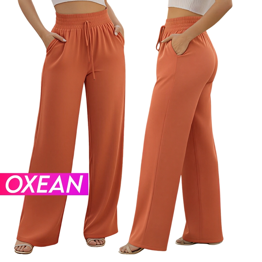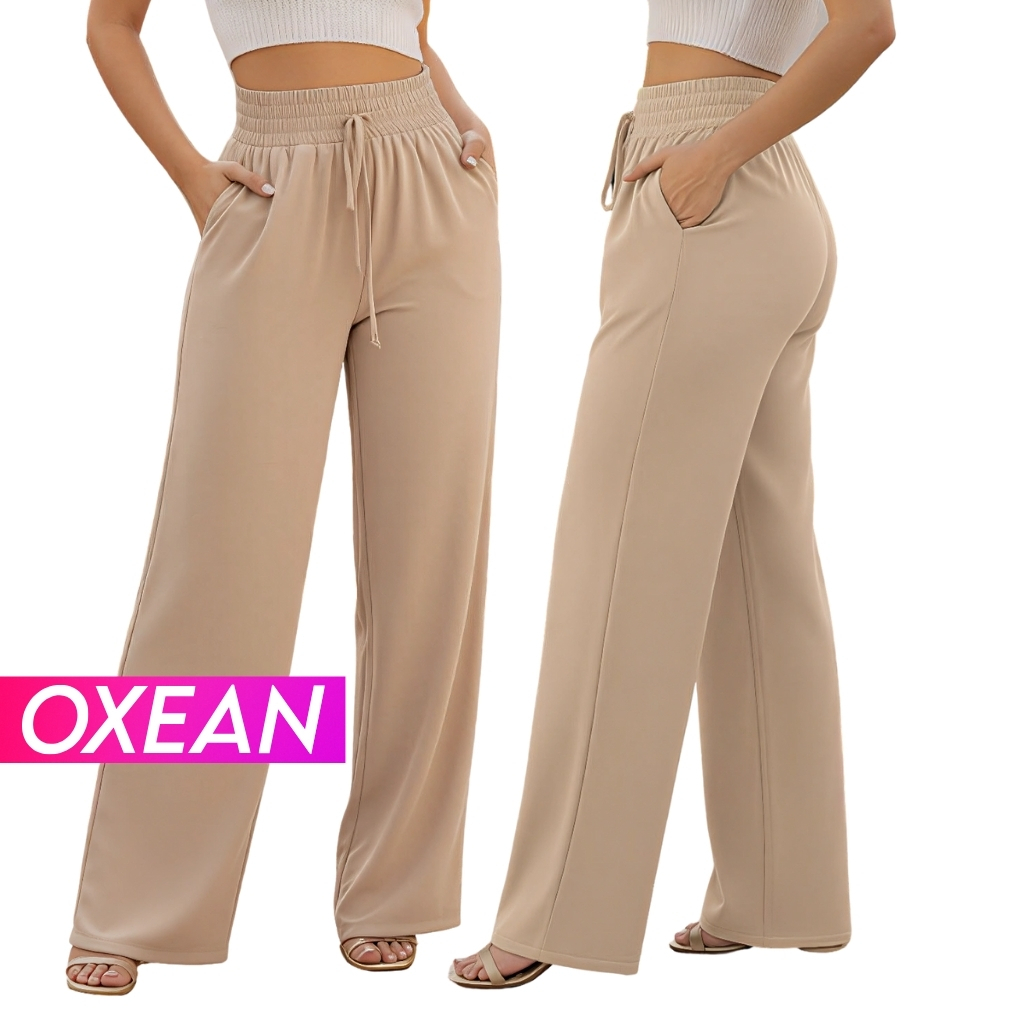 Calça Pantalona Feminina Elástico Na Cintura Com Bolso Cintura Alta Tecido Duna