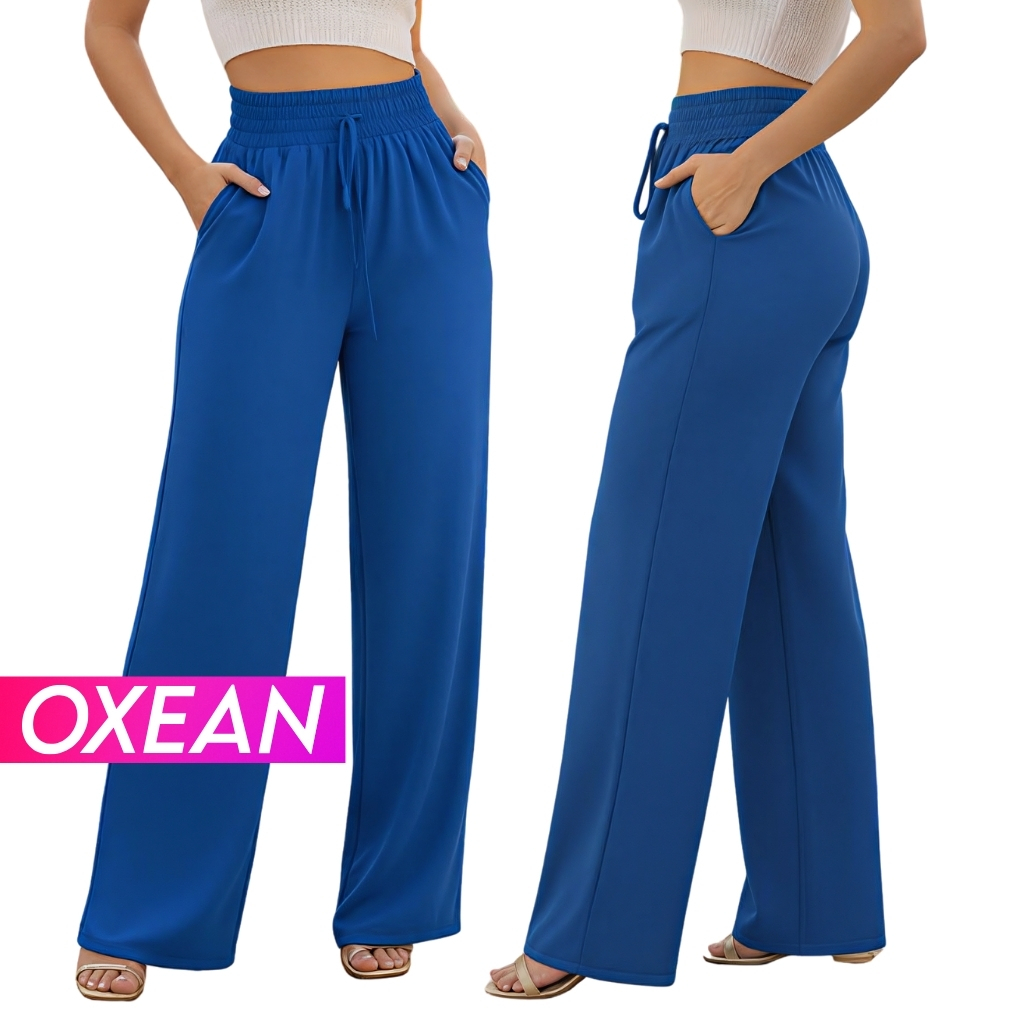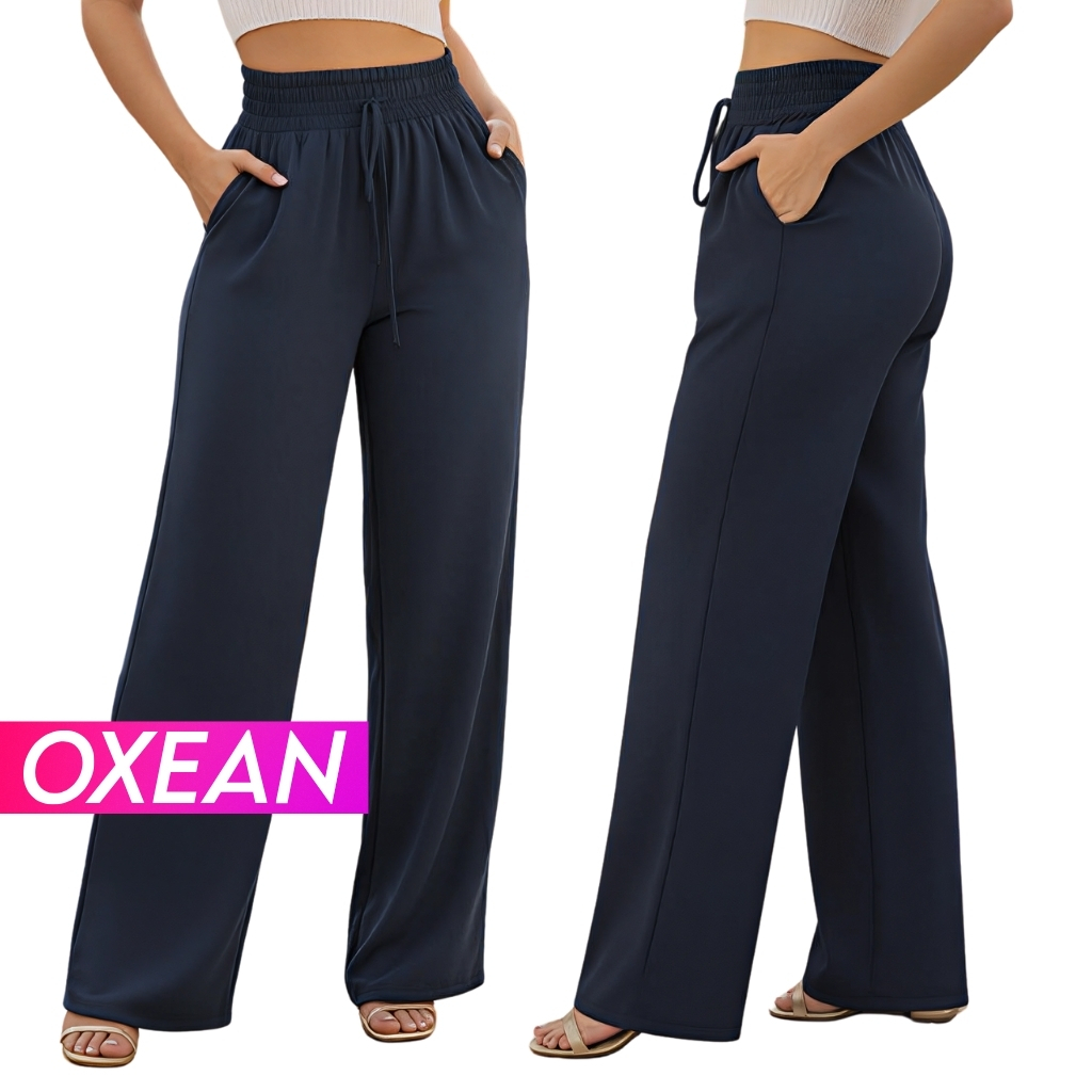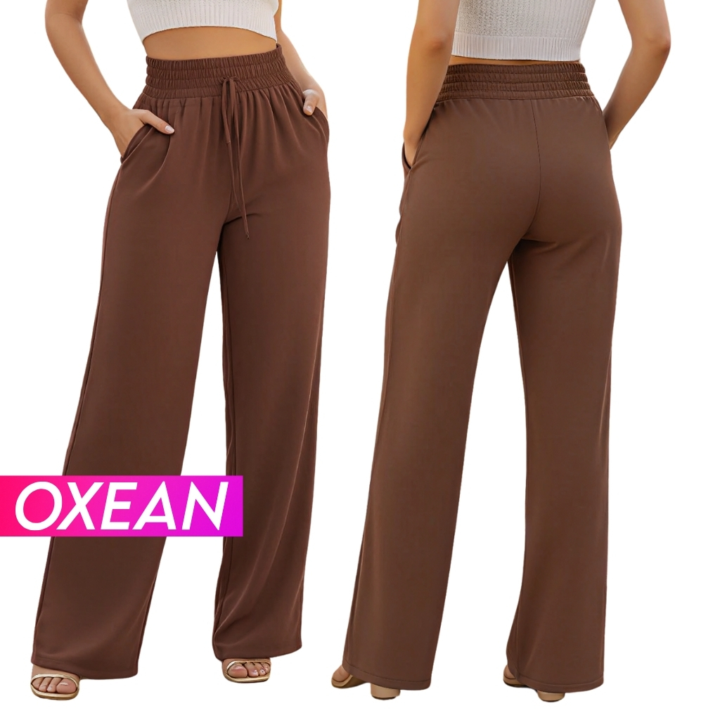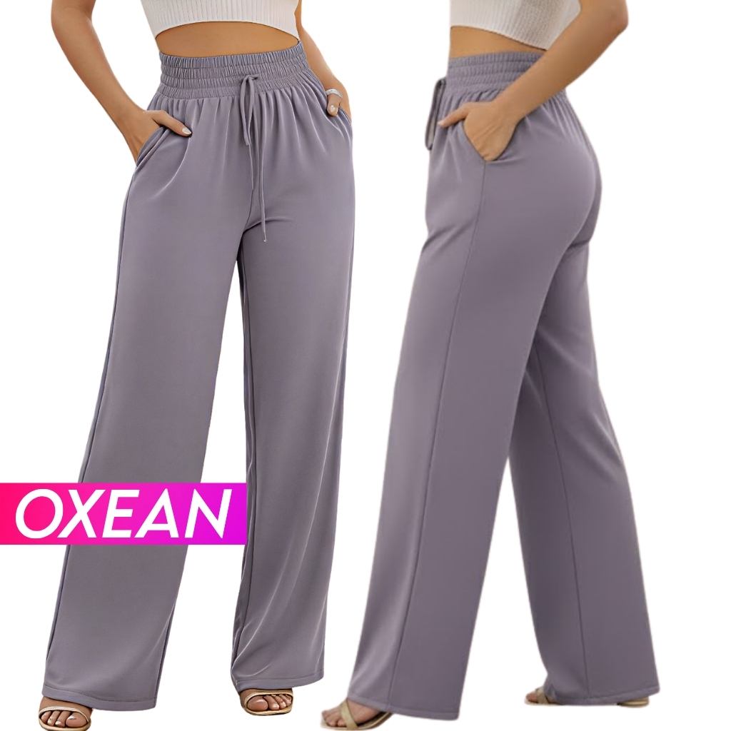 Calça Pantalona Feminina Elástico Na Cintura Com Bolso Cintura Alta Tecido Duna