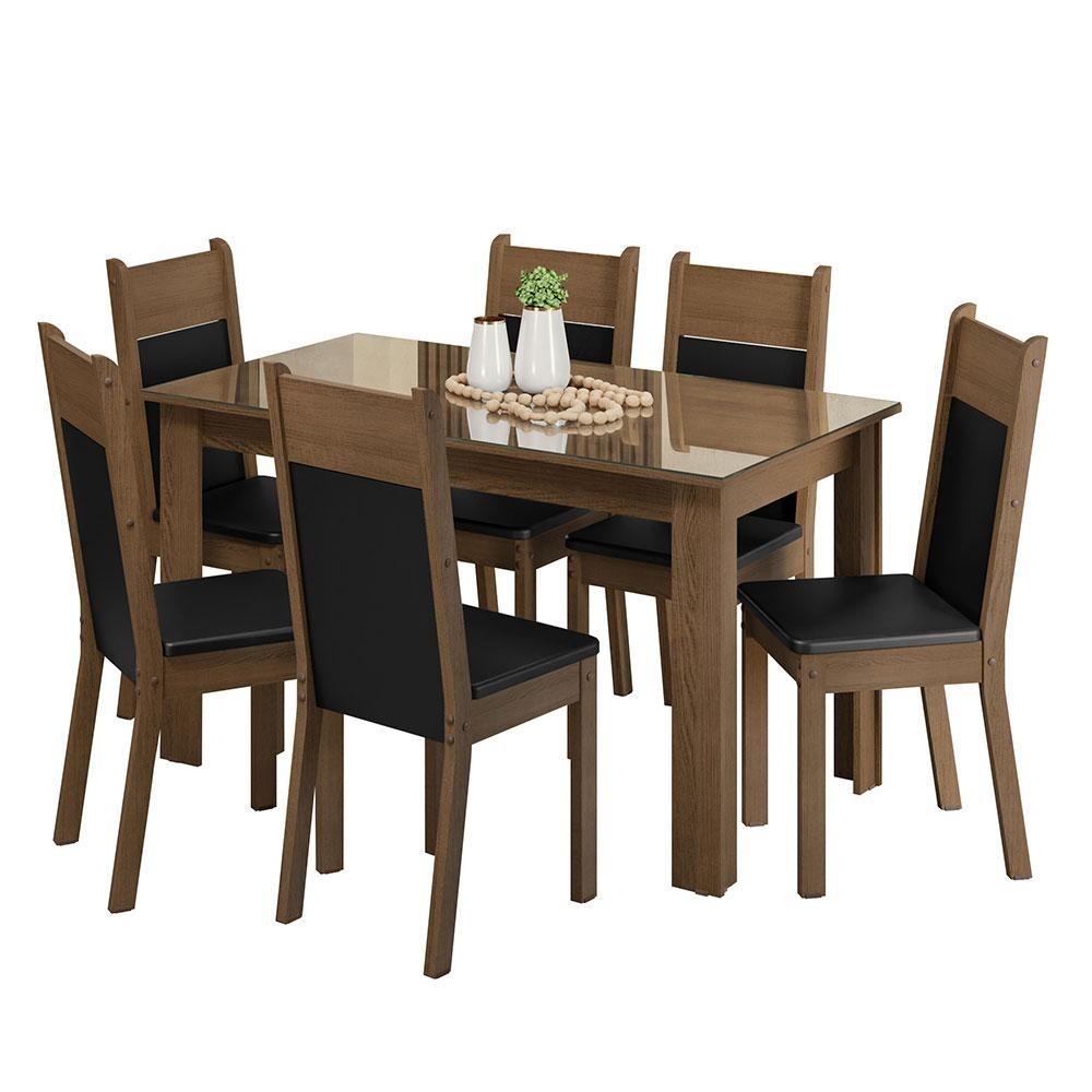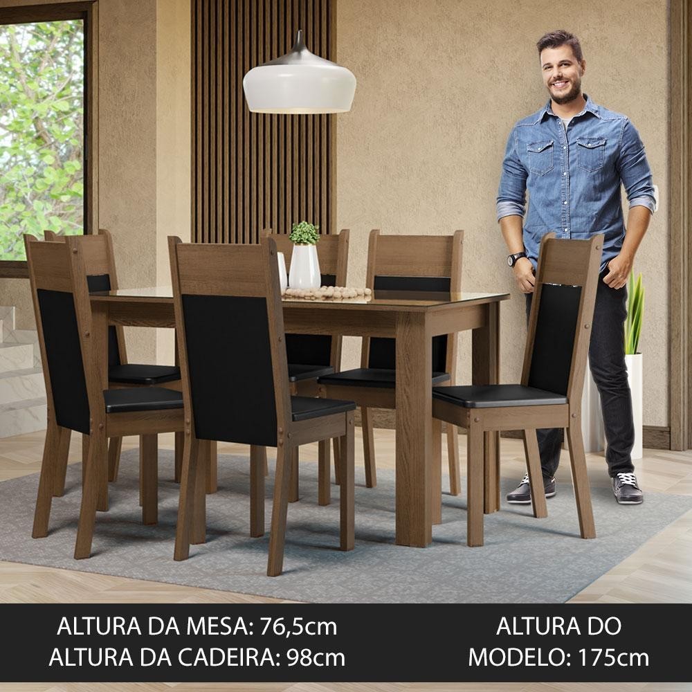 Conjunto Sala de Jantar Mesa Tampo de Vidro 6 Cadeiras Rustic/Preto Dora Madesa