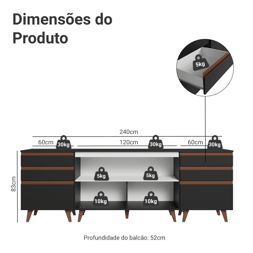 Kit com Três Balcões de Cozinha 2 Portas 6 Gavetas (com tampo) Preto Reims Madesa
