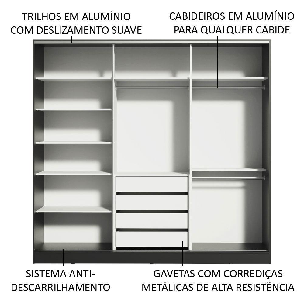 Guarda Roupa Casal 100% MDF Madesa Royale 3 Portas de Correr com Espelho - Preto/Branco