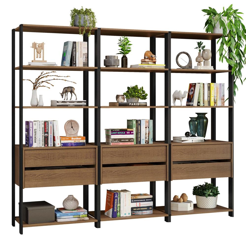 Estante Armário Multiuso para Livros 6 Gavetas 12 prateleiras 210cm Rustic/Preto Madesa