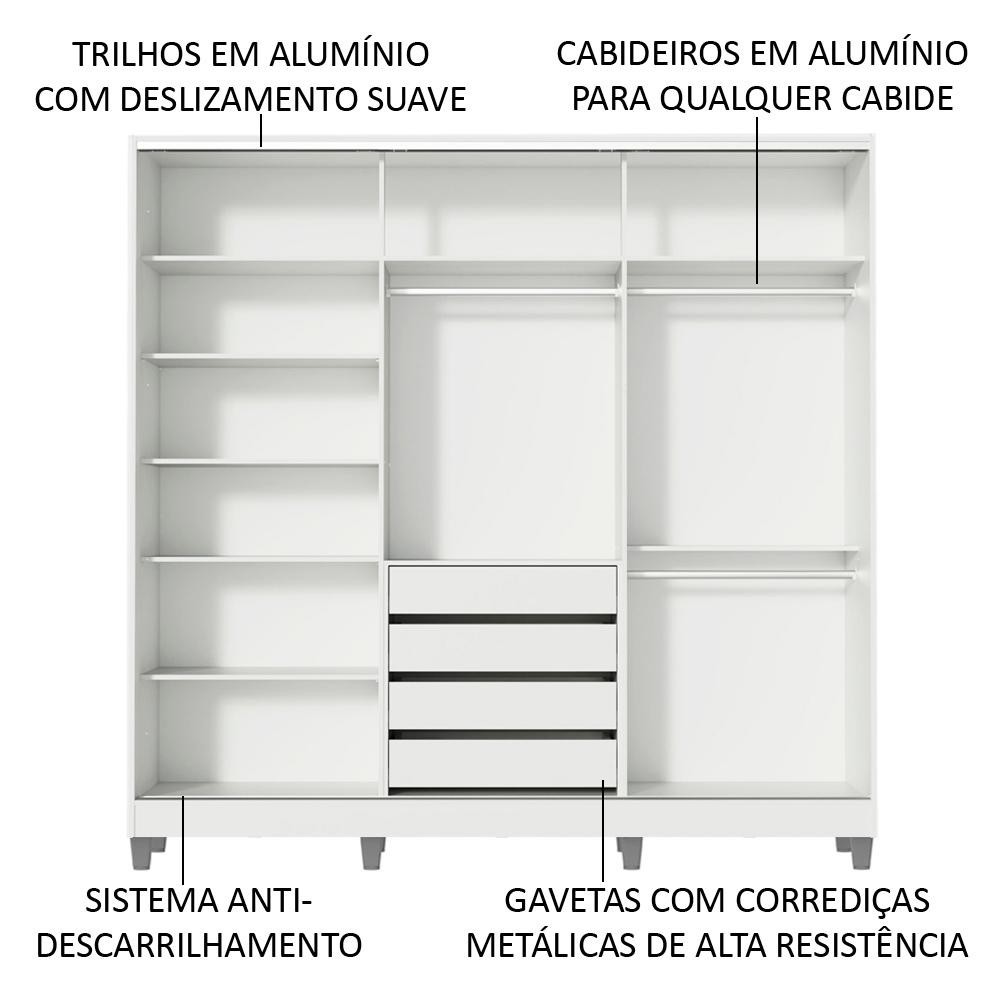 Guarda Roupa Casal 100% MDF Madesa Eros 3 Portas de Correr com Espelho com Pés - Branco/Rustic