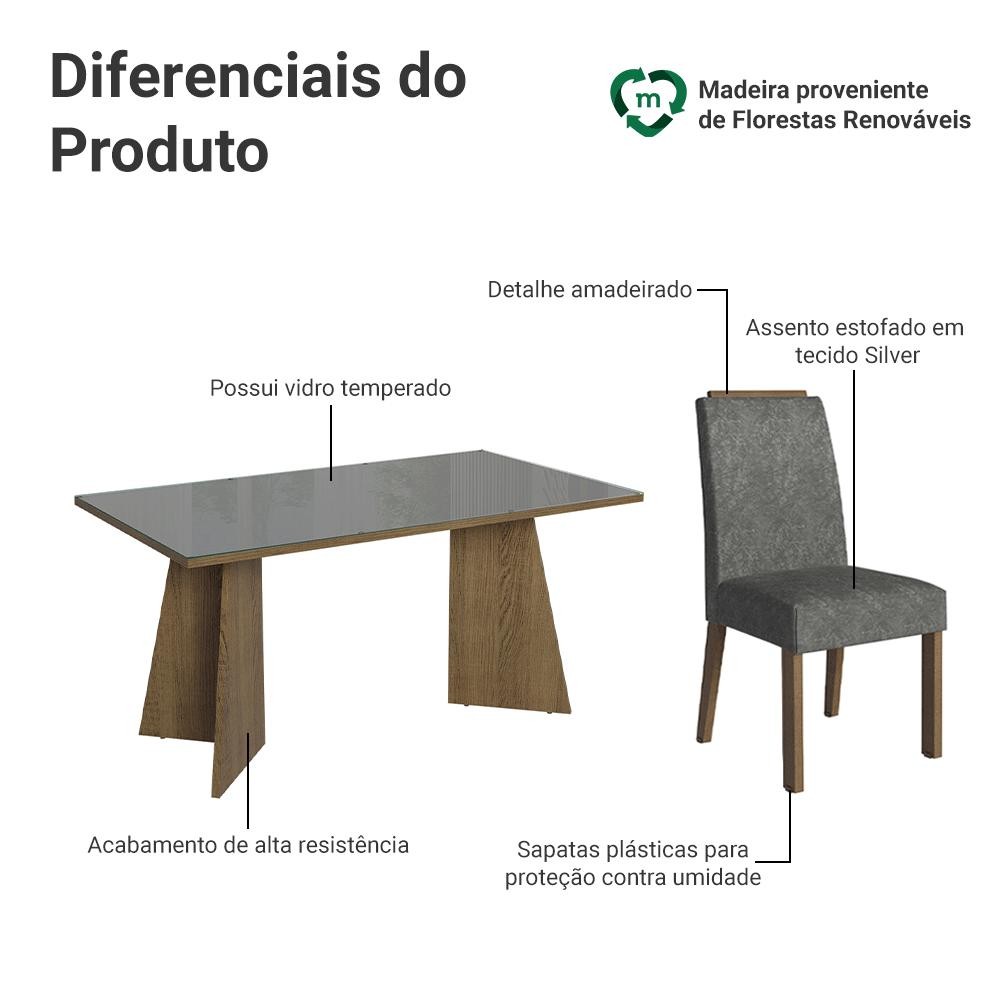 Conjunto Sala de Jantar Tampo de Vidro 6 Cadeiras Rustic/Cinza/Silver Madrid Madesa