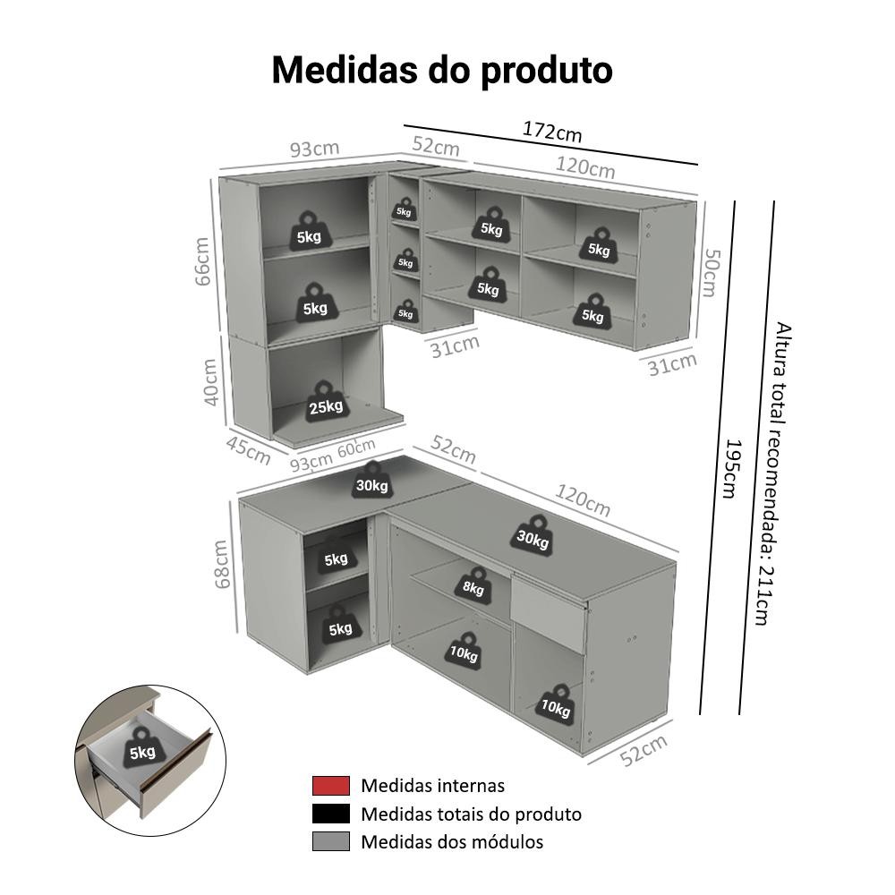Armário de Cozinha Completa de Canto 265 cm Suspensa Crema Nice Madesa 06